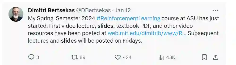 【导读】MIT科学家Dimitri P. Bertsekas在ASU开设了2024《强化学习》课程,讲述了强化学习一系列主题。Dimitri 的专著《强化学习与最优控制》,是一本探讨人工智能与最优控制的共同边界的著作。