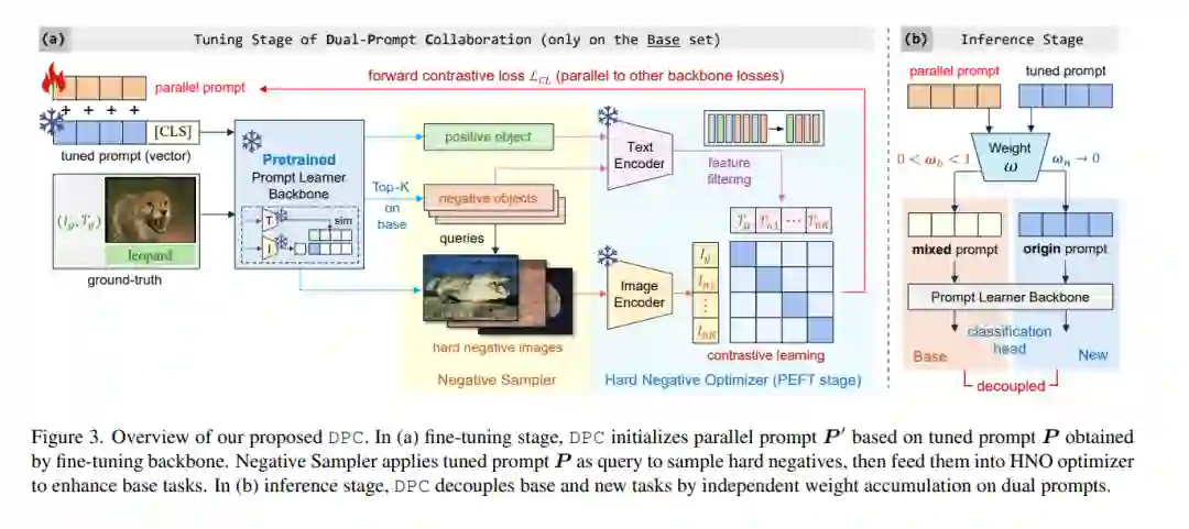 基础-新类别权衡(BNT)问题在基于 CLIP 的提示调优(Prompt Tuning)优化过程中普遍存在,表现为对基础(目标)类别的持续微调会同时导致模型在新(未见)类别上的泛化能力下降。现有方法尝试通过添加约束来调节提示调优过程,以平衡 BNT 问题。然而,这些约束作用于同一目标提示,无法完全避免基础类别和新类别优化方向之间的互斥性。针对这一挑战,我们提出了一种即插即用的双提示协作(Dual-Prompt Collaboration, DPC)框架,首次在提示级别上解耦基础任务和新任务的优化过程。具体而言,我们基于骨干提示(backbone prompt)克隆了一个可学习的并行提示,并引入了一个加权解耦框架(Weighting-Decoupling Framework),以独立控制针对基础任务或新任务的双提示优化方向,从而避免泛化冲突。同时,我们提出了一种动态硬负样本优化器(Dynamic Hard Negative Optimizer),利用双提示为基础类别构建更具挑战性的优化任务,以增强模型性能。为了增强可解释性,我们证明了提示向量在优化过程中的特征通道不变性,为 DPC 的加权解耦提供了理论支持。在多个骨干模型上的广泛实验表明,DPC 能够在不引入任何外部知识的情况下,显著提升模型在基础类别上的性能,同时保持对新类别的泛化能力。代码已开源,可在以下链接获取:https://github.com/JREion/DPC。