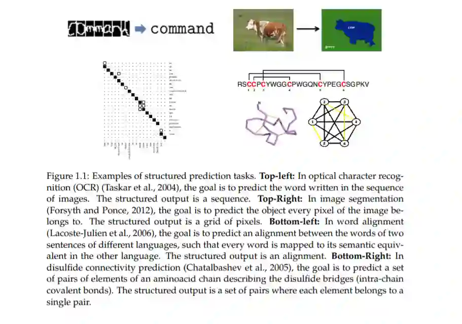 分类是监督学习的一个分支,其目的是估计由输入-输出对组成的数据的离散值映射。最经典和研究得最充分的设置是二值分类,其中离散预测器取0或1作为值。然而,大多数实际的分类设置处理大型结构化输出空间,如序列、网格、图、排列、匹配等。结构化预测与普通的二进制或多类分类之间有许多基本的区别,例如输出空间相对于输出对象的自然维数呈指数级大,以及学习任务的代价敏感性质。本文的重点是结构化预测的替代方法,其中典型的棘手的离散问题是通过一个凸连续替代问题来解决的,而这个问题又可以使用回归技术来解决。在结构化设置中,输出空间的大小和任务的成本敏感性定义了二进制情况下不存在的新挑战。本论文的主要工作是建立代理方法的一般理论,研究Fisher一致性、校准、训练复杂性和推理复杂性等统计和计算性质。更具体地说,本文中出现了两种主要的代理策略:概率方法(也称为插件分类器)和非概率方法。对第一种类型的主要贡献是对现有的和最近提出的结构化概率代理的定量校准分析,这是获得这些估计的保证的关键因素。第二种类型的主要贡献包括对最大最小损失的统计和计算分析、最近提出的用于结构化预测的校准多面体替代损失以及对结构化最大损失(也称为结构性支持向量机)的一致性分析、这是二进制支持向量机的经典扩展到结构化输出空间。