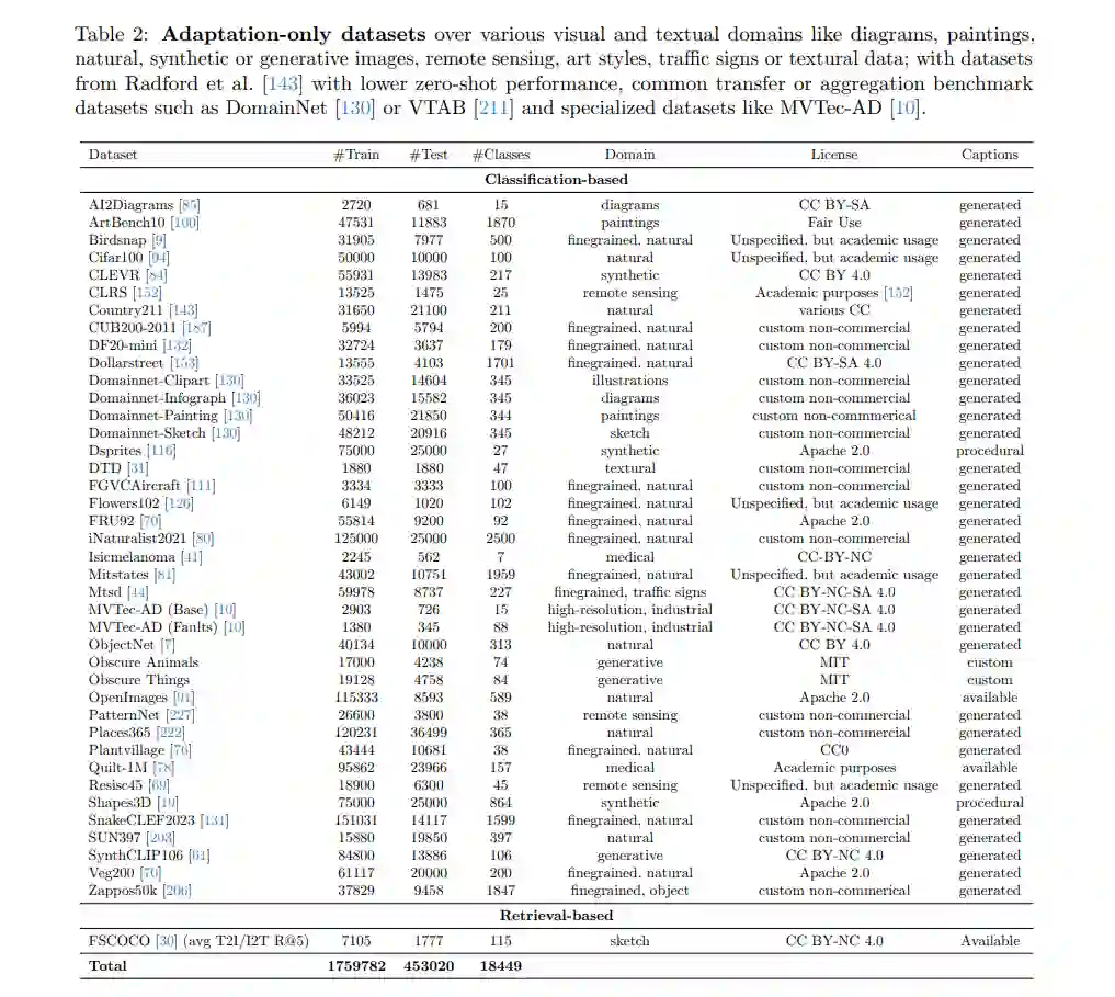 创建合适的基准。 为了在长模型生命周期内可控地研究多模态模型的不同专业(小规模)更新,我们引入了FoMo-in-Flux(Foundation-Models-in-Flux,见图1)。FoMo-in-Flux基于63个图像分类和图像-文本检索数据集(公开或本工作的一部分)构建,增强了字幕以实现多模态预训练。与TiC-RedCaps和DataComp [49, 45] 等单片、噪声较大的网页抓取数据集不同,FoMo-in-Flux包含经过精心挑选的高质量样本,具有细粒度的类别信息,并对跨越不同视觉和语义领域(如自然和合成图像、抽象或程序生成数据)的数据流进行了精确控制。
