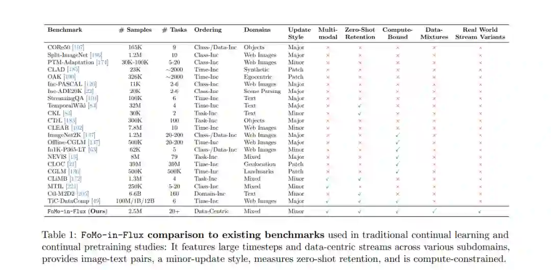 通过在统一且现实的计算预算内对不同模型系列进行研究和比较,我们相信本文能够为多模态持续预训练系统的实际部署提供若干实用指南,并且FoMo-In-Flux可以作为一个有意义的测试平台,以更好地理解持续预训练。