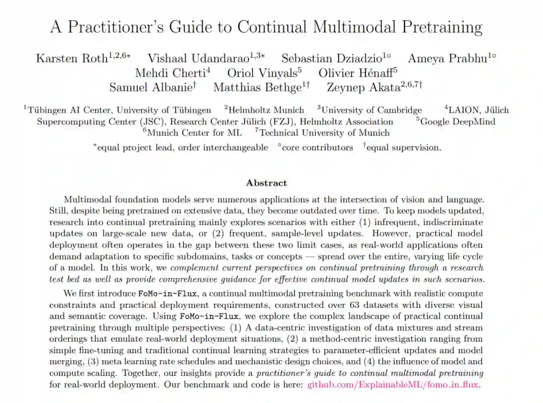 我们首先介绍了FoMo-in-Flux,这是一个具有现实计算限制和实际部署需求的持续多模态预训练基准,基于63个具有多样化视觉和语义覆盖的数据集构建。在FoMo-in-Flux的基础上,我们从多个角度探讨了实际持续预训练的复杂景观:(1) 数据为中心的研究,探讨模拟现实世界部署情境的数据混合和数据流顺序;(2) 方法为中心的研究,从简单的微调和传统的持续学习策略,到参数高效的更新和模型合并;(3) 元学习率调度和机械设计选择;以及(4) 模型和计算扩展的影响。我们的见解共同为实际部署提供了一份持续多模态预训练的实用指南。我们的基准和代码在此处提供:github.com/ExplainableML/fomo-in-flux。