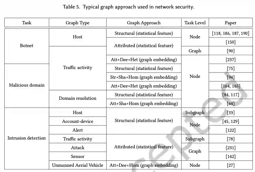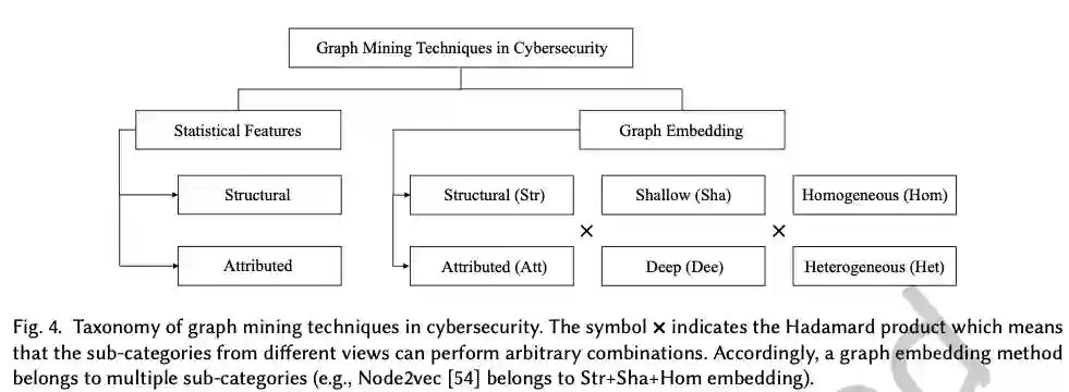 根据网络安全中使用的图挖掘技术,我们将现有的方法分为两大类。(1) 统计特征。这类方法基于人工构建的高维稀疏统计特征。根据是否利用图的属性信息,统计特征进一步分为结构特征和属性特征。(2) 图嵌入。与统计特征不同,图嵌入将特征向量从稀疏转换为密集,并自动保留结构和属性信息。我们从三个角度给出了图挖掘方法的分类:结构/属性(是否使用属性信息)、浅层/深层(是否使用深度学习)和同构/异构(是否关注异构图)。这些分类法可以从全面的角度关联不同网络安全任务的特征。例如,一些网络安全任务(如僵尸网络检测)对结构特征敏感,而其他任务(如欺诈检测)则更关注属性信息;恶意软件分析,地下市场分析通常在异构图上进行,函数调用关系通常被构造为同构图。图4给出了网络安全中使用的图挖掘技术的详细分类。