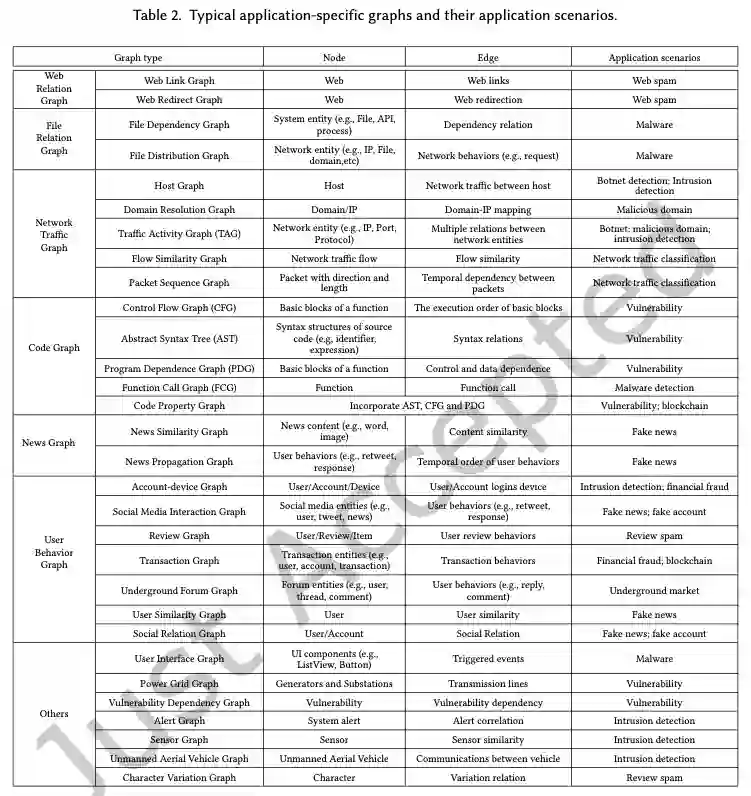 基于图的网络安全解决方案的一般过程主要包括五个步骤。首先,我们应该关注各种网络攻击中的一个特定的网络安全任务(如僵尸网络检测),并分析任务属性,给出明确的任务划分。然后,对于混合了各种实体的复杂网络空间,我们应该收集和处理支持任务属性的数据。基于任务分解和处理后的数据,可以构建针对特定应用的图结构,捕捉相关网络实体之间丰富的交互,这也是关键的一步,表2给出了一些常用的图结构。接下来,应该为这项任务仔细设计一个优化模型。最后,将通过相应的指标对所提出的模型进行评估,并在现实世界场景中进一步部署。