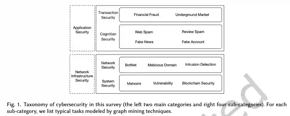 二. 网络安全基础: 在本综述中,网络安全任务的详细分类如图1所示。具体来说,我们将网络安全任务分为两大类,即应用程序安全和网络基础设施安全。网络基础设施安全侧重于保护互联网的关键基础设施和组件,如域名系统(DNS)、网络链路和路由器,以确保互联网在值得信赖的环境中工作。我们进一步在网络和系统层面对网络基础设施安全进行了分类,其中包括特定的网络和系统安全任务 (例如僵尸网络检测和区块链安全)。应用程序安全旨在保护运行在网络基础设施之上的各种应用程序的安全,并将其进一步划分为认知安全和交易安全。认知安全主要关注各种网络应用(如假新闻和垃圾评论)影响人类认知的安全问题,而交易安全则强调威胁人类资产和金融秩序的在线交易(如金融欺诈和地下市场)中的安全问题。