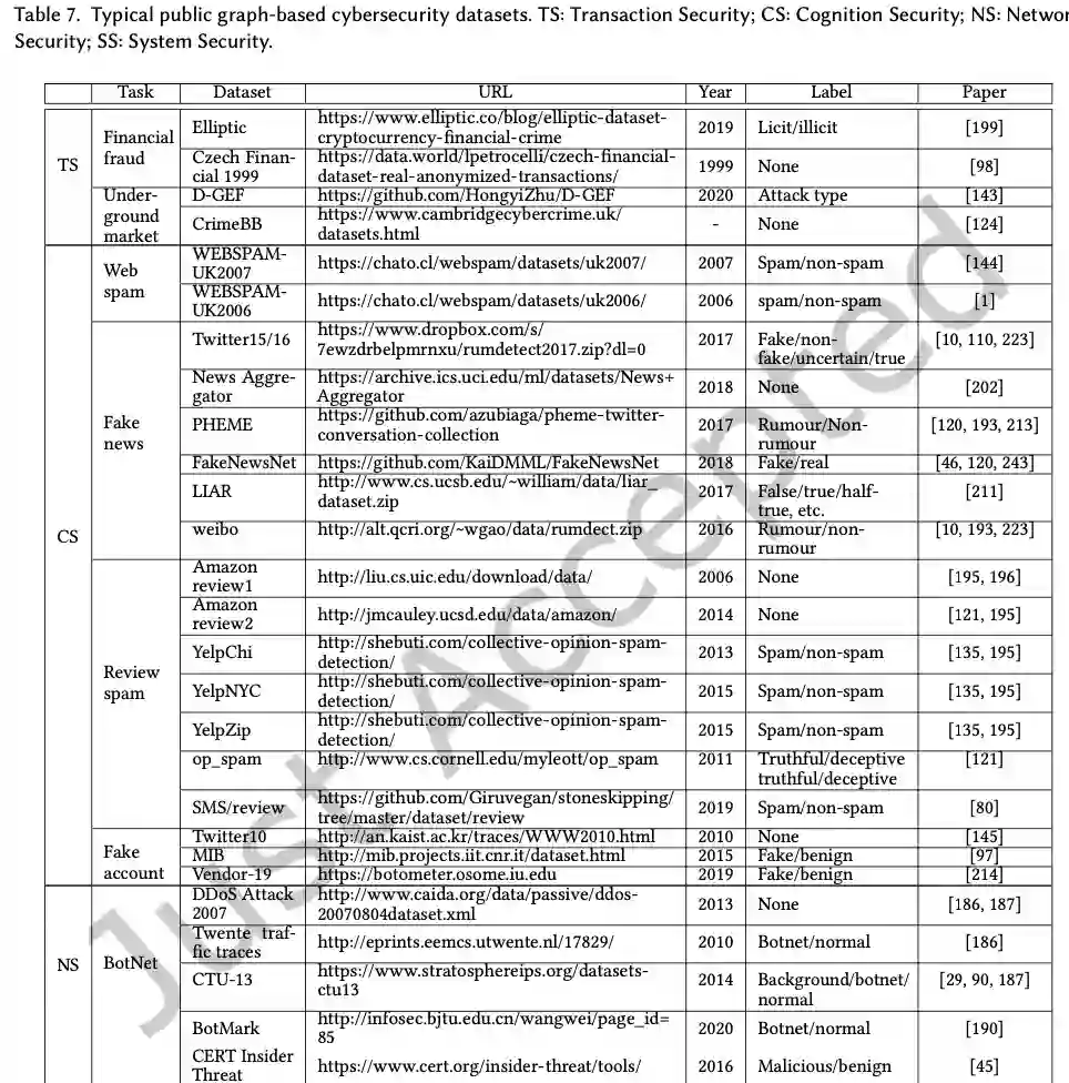 本综述也总结了图挖掘用于网络安全的开源数据集(表7(部分))和工具包。图挖掘工具包包括PYG,CogDL,DGL,OpenHGNN,GammaGL等。网络安全数据收集工具包括Twitter Search API,Snopes,VirusTotal等。