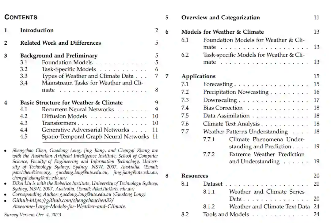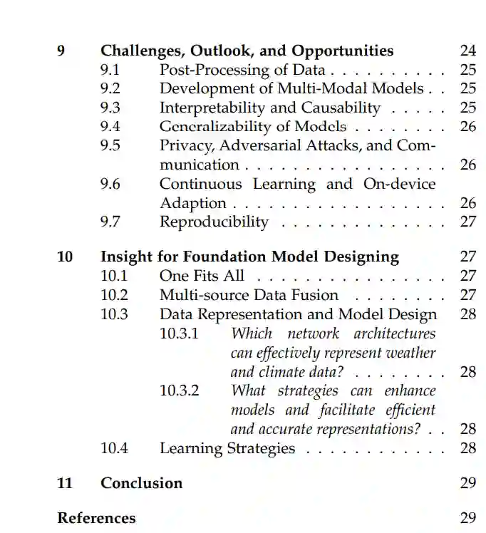 文章组织。本综述的其余部分结构如下:第2节阐述了我们的综述与其他相应研究之间的区别。第3节为读者提供关于基础模型、天气和气候数据的基本描述以及相关任务的基本知识。第4节详细阐述了天气和气候任务的关键模型架构。第6节,我们介绍了目前用于天气和气候任务的主要模型分类的概要,包括气候基础模型和特定任务模型。该节在深入探讨个别方法论的复杂性之前,提供了该领域的整体视图。第5节简洁地介绍了气候基础模型和特定任务模型,并根据不同的模型架构进一步细分特定任务模型。随后,第7节进行了对特定天气和气候任务的数据驱动深度学习模型的广泛探索。考虑到缺乏统一和全面的天气和气候数据集索引,第8节提出了一套详尽的数据集资源和介绍,旨在为读者提供便利和效率。第9节概述了目前阻碍天气和气候基础模型发展的挑战,以及该领域未来的潜在方向。第10节提出了构建天气和气象基础模型的潜在蓝图,帮助从业者进行思考和执行,并促进气候基础模型的发展。最后,第11节对综述内容提供了总结和结论性评论。