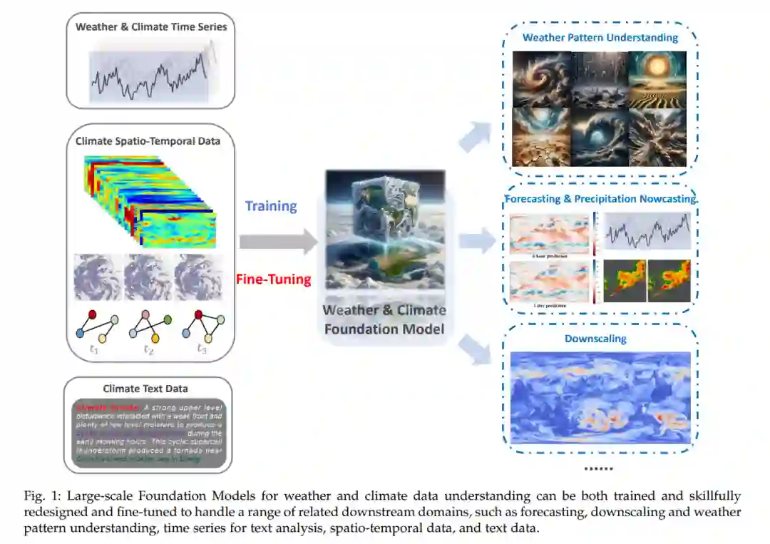 气候变化描述了全球温度和天气模式在长期内的显著变化。目前,我们的星球正经历着极端自然现象的激增,如干旱[1]、[2],洪水[1],地震[3],热浪[4]和强降雨[5],这些现象由不断加剧的气候变化所推动。加剧这些挑战的是全球变暖和海平面下降对生态系统的惊人威胁[6]、[7]。鉴于本世纪预计的地表温度增加,我们预见这些极端现象的严重程度和频率将加剧[8]。 利用先进的气候建模和预测技术,这些技术集成了大量的大气和地表变量 - 包括大气状况、洋流、陆地生态系统和生物圈相互作用 - 可以增强我们对气候变化的理解[9]、[10]。这些见解可以指导定制缓解策略的制定[11]。长期准确的海平面变化预测可以加强沿海城市的城市规划和灾害准备工作[12]、[13]、[14]。短期内,降雨、温度和湿度的精确预测可以提高包括农业规划和交通调度在内的人类活动的安全性[15]、[16]、[17]。 传统上,一般环流模型(GCMs)[18]和数值天气预报模型(NWPs)[19]、[20]、[21]一直是研究气候变化趋势和预测未来天气和气候情景的首选工具。这些模型融合了主要的地球系统组成部分,包括大气、地表和海洋,以模拟地球系统的多维动态。它们通过复杂的物理方程式,如大气动力学,确定这些组成部分之间的潜在非线性关系,以在广泛的物理参数范围内生成预测[22]。然而,尽管它们已经相当成熟,数值受限的天气预报模型仍面临许多挑战和限制。其中之一是它们对地方地理特征的过于简化的表现[23],因为它们通常无法捕捉到对区域天气和气候模式产生关键影响的地方地形的复杂细节。另一个障碍是有效地整合来自不同来源的观测数据,如气象站、雷达和卫星[8]。传统模型通常难以将这些具有不同空间和时间分辨率的数据纳入其建模框架。此外,它们需要大量的计算资源来管理众多的物理限制[24]。地球系统的复杂性和规模要求进行大量的计算,给计算能力和效率带来挑战。 人工智能技术的快速发展为天气和气候建模引入了成本效益高、直接且简化的解决策略。特别是,机器学习(ML)和深度学习(DL)技术可以识别天气和气候数据中的潜在趋势表示,从而绕过对复杂物理关系的需求。最初,鉴于ML技术相较于大规模、长时间的物理模型的有限能力,它们被少量用于短期、局部的天气和气候条件预测。然而,过去十年目睹了数据驱动深度学习方法在天气和气候研究中的应用呈指数级增长,这得益于全球天气和气候数据的爆炸性扩展[25]、[26]。依托丰富的数据资源和计算技术的进步[27]、[28],这些模型正在革命性地改变气候科学[29]。利用大量数据,深度学习模型揭示了隐藏在气候变量中的复杂非线性关系,从而以更高的精确度捕捉气候系统的动态性和复杂性[30]、[31]。然而,这些模型通常为特定任务而设计,并使用特定格式的数据进行训练,如区域天气预测或微观尺度的降尺度。训练数据来源的表现方式差异导致了数据驱动深度学习模型在理解天气和气候数据方面的过度分化功能。因此,开发能够微调以模拟全球天气和气候系统的通用气候模型成为一个重大挑战。