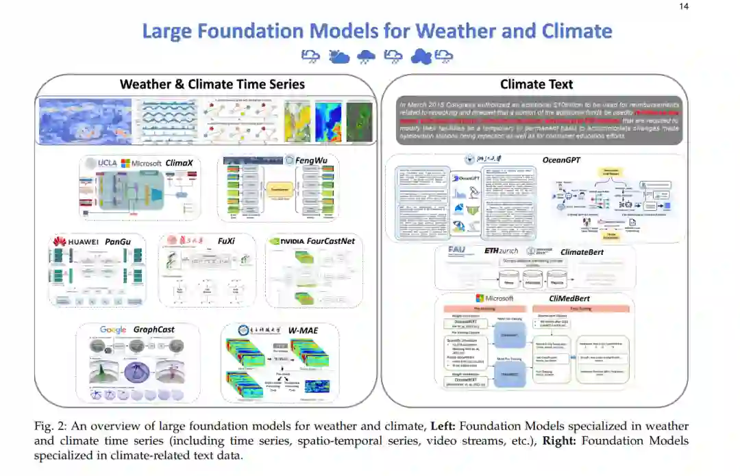 蓬勃发展的基础模型在NLP [47]、[82]、[200]和CV [45]、[46]领域已激发了对天气和气候数据理解基础模型的研究兴趣。通过预训练策略创建的大型基础模型可以显著提高基于AI的气候模型的泛化能力,并可以针对特定的下游任务进行微调。这类模型的预训练需要大规模序列数据,这不是通常从普通时间序列数据中获取的。 考虑到计算效率和对及时气候预测的需求,Pathak等人提出了FOURCASTNET [136],这是一种基于视觉变换器和自适应傅里叶神经网络运算符(AFNO)[201]的气候预训练基础模型,用于高分辨率预测和快速推理。其训练过程包括基于预训练模型的自监着预训练和自回归微调。PANGU-WEATHER [63],一个利用3D地球特定变换器的数据驱动模型,以其快速、精确的全球预测和卓越性能而闻名。它根据当前状态预测随时间变化的大气状态,当前状态由上空五个变量和四个地表变量在0.25°水平网格上的13个垂直层描述。另一方面,CLIMAX [25] 通过其基于变换器的完全监督预训练,将基础建模概念引入天气预测。它提出变量消歧和变量聚合策略,用于合并和揭示不同天气变化在不同高度的潜在关系,为适应包括全球/区域/季节性预测、气候绘制和降尺度任务在内的多样化下游任务提供了有希望的灵活性。FENGWU [138] 以独特设计的深度学习架构从多模态、多任务角度解决中期预测问题。它具有模型特定的解码器和跨模态融合变换器,在不确定性损失的监督下,以区域适应的方式平衡不同预测器的优化。鉴于上述大型模型是通过完全监督的方式训练的,W-MAE [64] 使用基于掩码自动编码器(MAE)[202]、[203]的方法,实施天气预测模型的无监督训练,这可以通过各种数据源微调用于下游任务。MetePFL [24] 和 FedWing [154] 还提出了基于提示的联邦学习[204],用于训练大型基础模型,大大降低了跨区域协作模型训练的成本,同时保护数据隐私。LLMs的快速发展导致处理天气和气候任务不再局限于视觉或时间序列模型。基于LLMs的OCEANGPT [197] 提出了处理广泛海洋相关任务的方法论。除了用于预测和模拟的基础模型之外,CLIMATEBERT [195] 是一种用于处理气候相关文本的基于NLP的基础模型。它在新闻文章、研究论文和公司气候报告等多种来源的200多万段气候相关段落上进行训练[205]。 结论