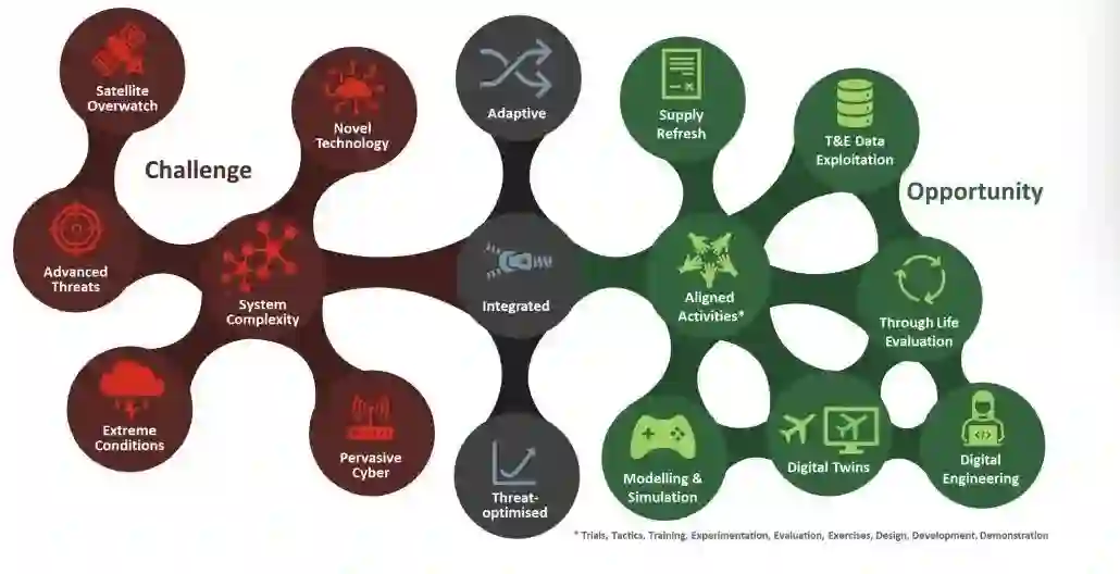 为了根据指导原则、挑战和优先事项衡量成功,测试和评估方法需要逐步改变。在承认英国现场试验能力的价值的同时,需要拥抱一个更加数字化的未来。 有几个因素正在推动这一变化(见图5)。需要克服不断上升的系统复杂性和卫星监视等挑战,但也存在一些机会,例如在能力生命周期的早期开始进行持续评估,以便在最能利用的时候引入反馈。建模和仿真、数据开发和持续数字评估的采用可以使国防部和供应商具备定义、设计和交付更具适应性、综合性和威胁优化的军事能力的洞察力。