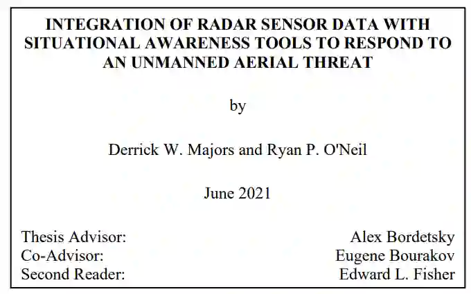 探测无人机系统(UAS)非常复杂。在多个领域(空中、陆地和海洋)整合和共享雷达信息是一个难题。目前有关无人机系统探测的研究主要集中在探测地面兵力和国家关键基础设施上空的无人机系统,但当无人机系统开始挑战港口或公海上的军舰时会发生什么?在多机构危机事件中,如何通过无线方式收集和共享信息?探测到的无人机传感器数据能否通过无线网格网络(WMN)与其他机构共享?研究表明,在一次小规模的多机构危机响应演习中,可以将 SAAB 的 G1X 雷达系统的模拟数据与战术突击套件(TAK)态势感知应用程序集成在一起。该技术运行完美;但是,注意到,必须进一步检查和改进反无人机系统战术技术和程序(TTP)、国际无人机系统法律法规以及提示和自动化,以适应当今的战斗和机构间响应。此外,发现在演习期间,手机信号无法有效覆盖旧金山湾。为了缩小这一差距,使用 Persistent Systems 公司的 MPU-5 无线电设备成功扩展了 WMN,从而在非网络环境中创造了更广泛的维护网络功能的能力。