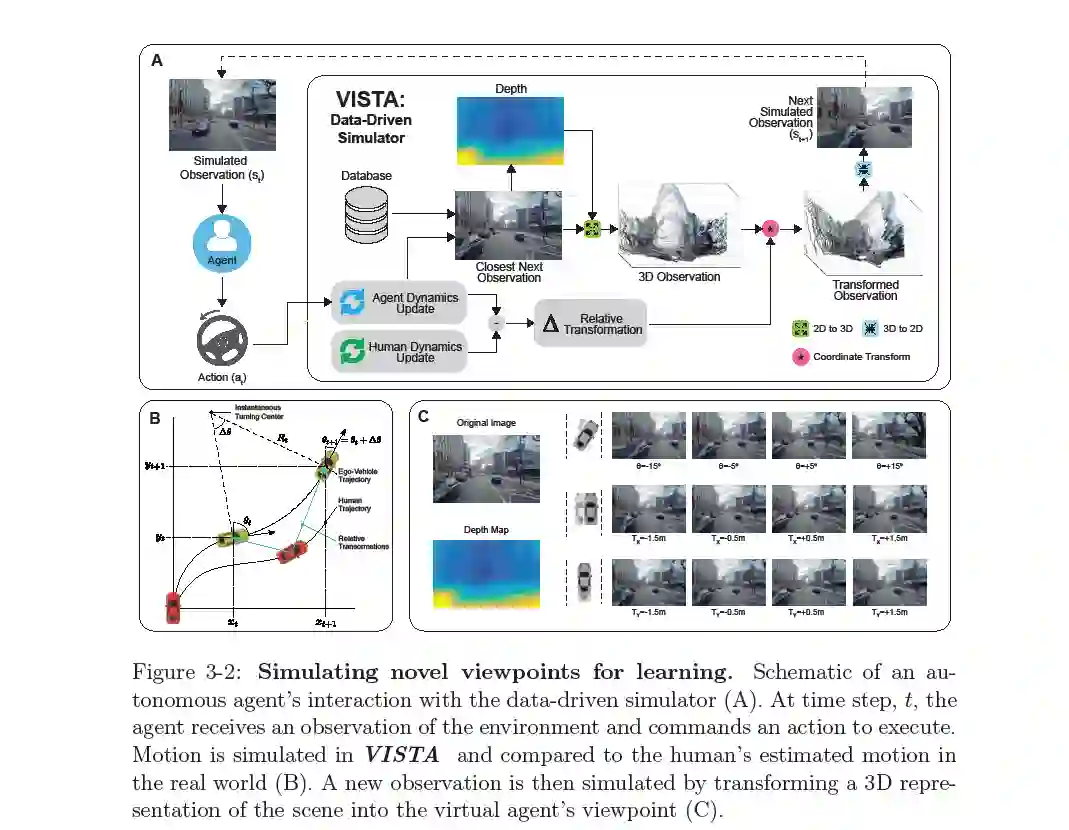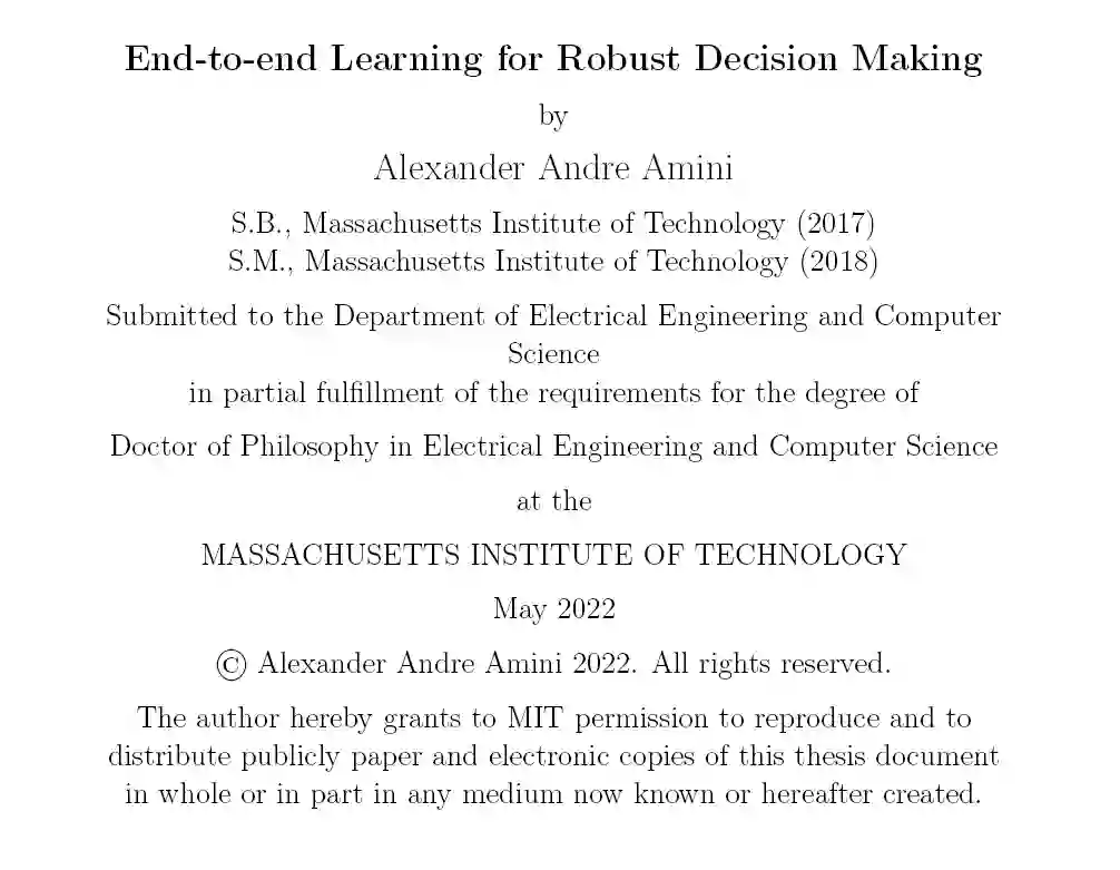 在本论文中,我们开发了新的基于学习的方法,以实现自主系统的动态、弹性和稳健决策。通过解决在所有阶段出现的关键挑战,从用于训练的数据,到在这些数据上学习的模型,再到算法,以可靠地适应部署期间的意外事件,来推进野外的鲁棒决策。我们首先探索如何通过计算设计丰富的合成环境,能够模拟连续的难以收集的、分布外的边缘情况,在训练和评估期间易于使用。利用这个丰富的数据基础,我们随后创建了高效、富有表现力的学习模型,以及优化其表示的必要算法,并克服了代表性不足和具有挑战性的数据中的不平衡。最后,使用经过训练的模型,我们将转向部署设置,在该设置中,我们仍然应该预期我们的系统将面临在训练中从未遇到过的全新场景。为此,我们开发了自适应和不确定性感知算法来估计模型的不确定性,并利用它的存在来实现一般化的决策,即使是在存在意外事件的情况下。