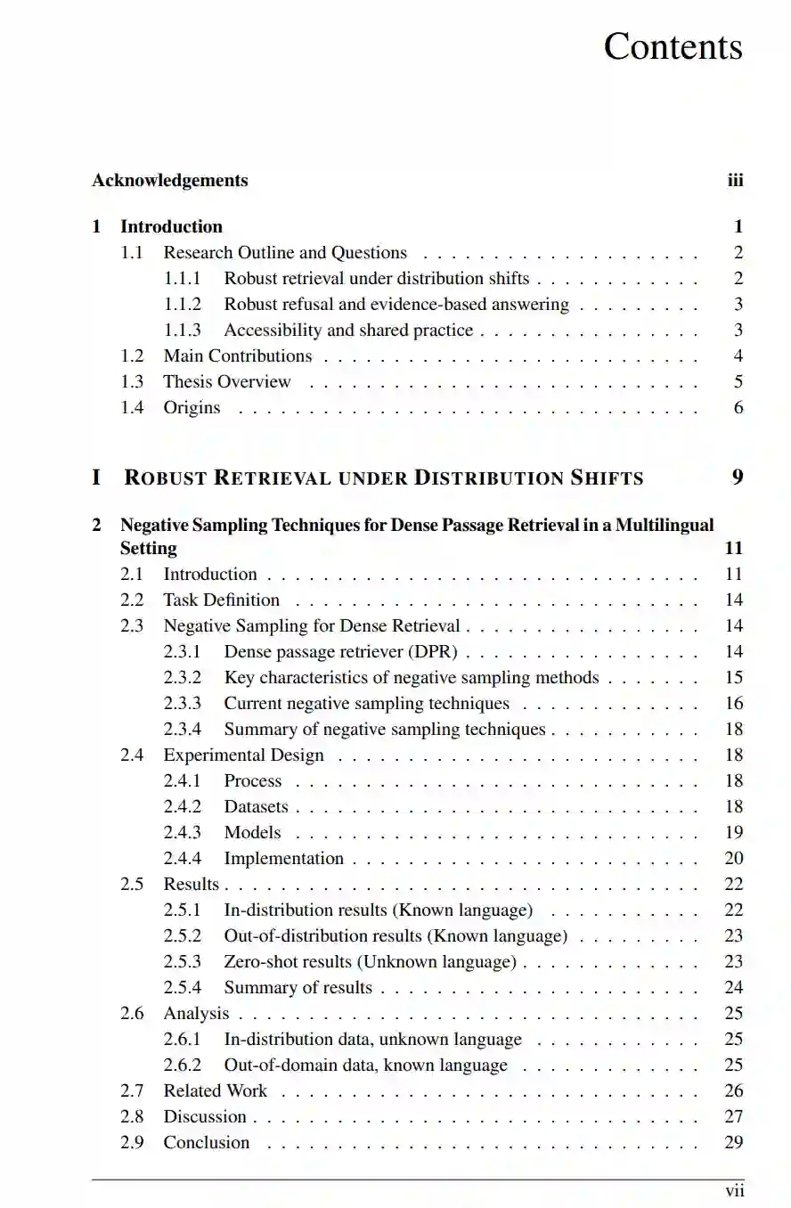 信息获取从未像现在这样便捷、迅速,却也从未如此脆弱。随着语言模型日益主导搜索与问答领域,检索信息与生成信息之间的界限已趋于模糊。旨在寻找相关文档的系统,现在通常会结合模型记忆与检索到的证据,缝合生成完整的回答与解释。尽管检索增强模型(RAG)使回答复杂问题变得轻而易举,但这种便利往往掩盖了其脆弱性:此类系统在测试条件与训练数据相似时表现最佳,而当二者不一致时则经常失效。 现代信息检索系统通常采用流水线架构(Pipeline Architecture),由检索器筛选候选文档,再由生成器根据这些文档生成回答。在这些系统中,检索与生成是紧密耦合的。实现可靠性能的关键在于两项要求:一是泛化性,即检索器在面对新数据集、新领域和新语言时依然有效;二是有据性,即生成器必须依据检索到的证据产出内容,并在证据缺失时拒绝回答。 本论文将这两项要求结合起来进行研究。文中考察了训练数据增强与负采样如何影响分布偏移下的稠密检索器,提出了增强跨领域及跨语言鲁棒性的方法,并研究了如何训练小型开源语言模型,使其能够基于检索到的证据进行推理,并在证据不足时拒绝回答。最后,本研究通过开源库 Simple Transformers 强调了技术的可及性,旨在降低构建与复现基于 Transformer 的检索及问答系统的门槛。