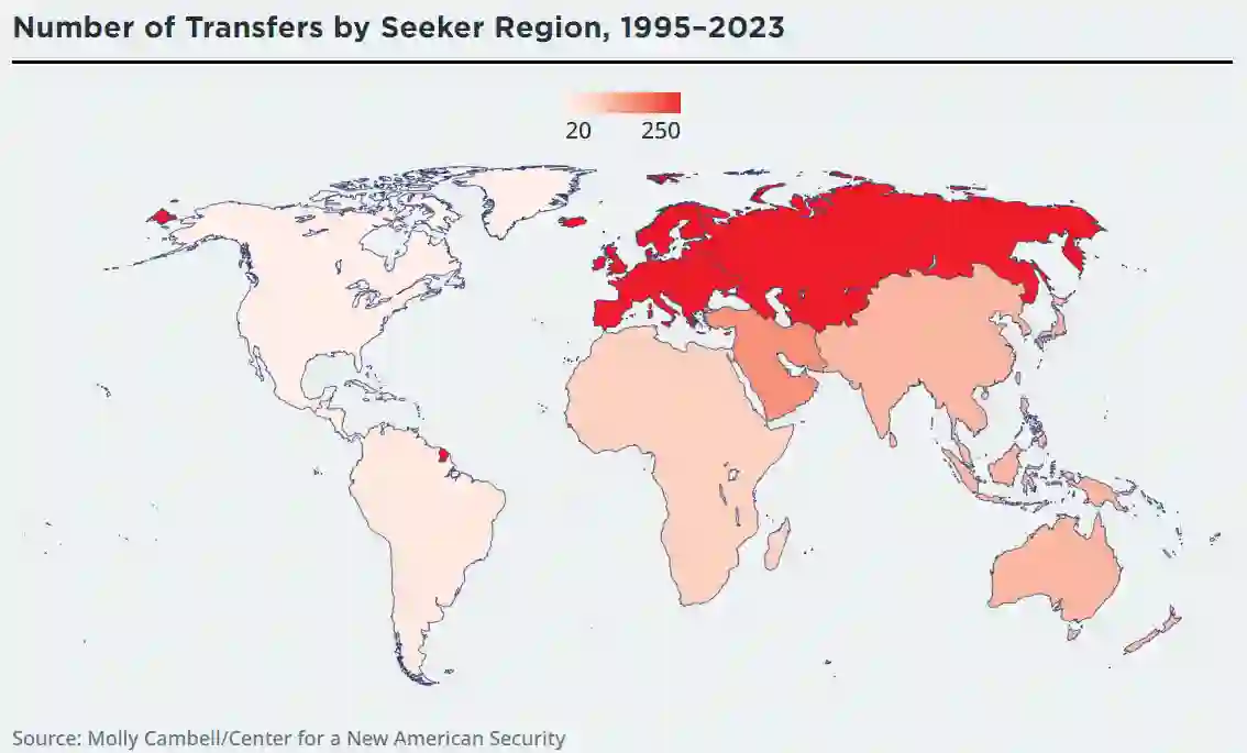 作者确定了 1995 年至 2023 年间的 633 次无人机转让,其中约 40% 流向了欧洲战场。"转让"一词指的是已完成和正在进行的对外军售、直接商业销售、租赁、赠送和二次扩散。在过去 20 年中,全球反恐战争也推动了中东地区的无人机扩散,在此期间,中东地区共接收了 134 架无人机。在非洲大陆,无人机扩散自 2020 年以来急剧增加。从 1995 年到 2019 年,该地区平均每年约有两次转让。从 2020 年 1 月到 2023 年 9 月,平均每年增加到近 13 次。在数据集中确定的 84 次记录在案的向非洲的转让中,有 51 次是自 2020 年以来发生的,其中相当一部分是武装的 Bayraktar TB2。