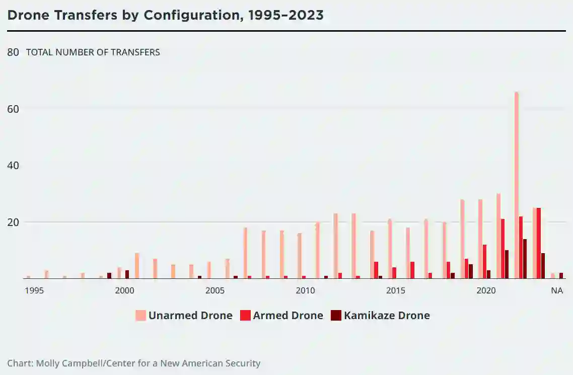 新美国安全中心(CNAS)的 “无人机扩散数据”追踪了1995年至2023年9月1日期间全球军用级无人机的转让情况,无论其规模和能力如何。该数据集是 CNAS 防务项目大型研究项目的一部分,该项目研究了无人机扩散的趋势和无人机在近期冲突中的使用情况。分析了无人机外交在美国和中国之间的战略竞争中所扮演的角色时借鉴了这一数据集。