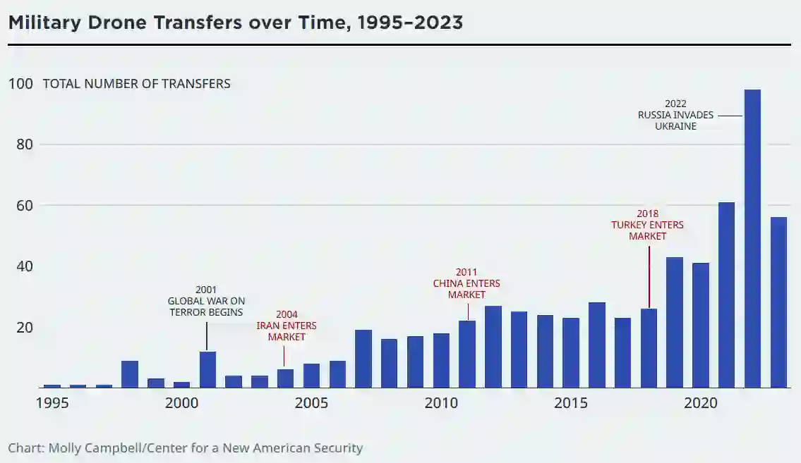 在过去 30 年里,无人机技术不断扩散,越来越多的国家和非国家行为者获得了无人驾驶系统。以色列和美国主宰无人机市场的时代早已一去不复返。中国、土耳其和伊朗已经开发出低成本的军用无人机。