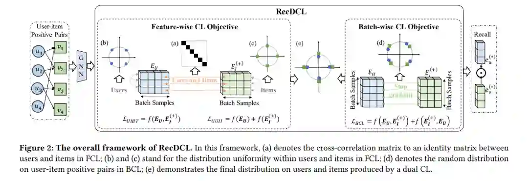 自监督推荐(SSR)在近年来在协同过滤中挖掘潜在的交互行为方面取得了巨大成功。作为一个主要分支,基于对比学习(CL)的SSR通过对比原始数据和增强数据之间的嵌入来克服网络平台中的数据稀疏性。然而,现有基于CL的SSR方法大多专注于批量方式的对比,未能利用特征维度中的潜在规律,导致在从网站上学习用户(项目)表征的过程中出现冗余解决方案。此外,同时利用批量对比学习(BCL)和特征对比学习(FCL)进行推荐的联合优势仍未被充分探索。为了解决这些问题,我们研究了BCL和FCL目标之间的关系。我们的研究表明,从理论和实验角度来看,采用这两种方法都有合作效益**。基于这些见解,我们提出了一种用于推荐的双重CL方法,称为RecDCL**。RecDCL首先以特征方式消除用户-项目正对中的冗余解决方案。然后,它使用多项式核从FCL视角优化用户和项目内的均匀分布。最后,它在批量目标中生成对比嵌入。我们在四个广泛使用的基准和一个工业数据集上进行了实验。结果一致表明,提出的RecDCL超越了最先进的基于GNN和基于SSL的模型(在召回率@20方面高达5.65%的提升),从而确认了联合目标的有效性。本文使用的所有源代码均可公开获取。