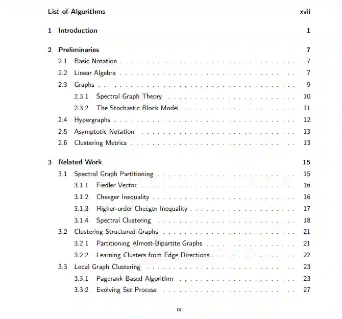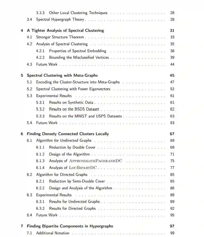 论文的第二部分在前一部分的理论保证的基础上,表明当底层图的簇具有一定的结构时,少于k个特征向量的谱聚类能够比使用k个特征向量的经典谱聚类产生更好的输出,其中k是聚类的个数。本文首次讨论和分析了少于k个特征向量的谱聚类的性能,并表明一般的聚类结构可以用谱方法学习。第三部分考虑使用局部算法高效地学习簇结构,其运行时间仅依赖于目标簇的大小,且与底层输入图无关。经典的局部聚类算法的目标是找到一个与图其他部分稀疏连接的簇,本文的这一部分提出了一种局部聚类算法,它可以找到一对彼此紧密连接的簇。这一结果表明,即使在现实世界中普遍存在的大图中,某些聚类结构也可以在局部环境中有效地学习。