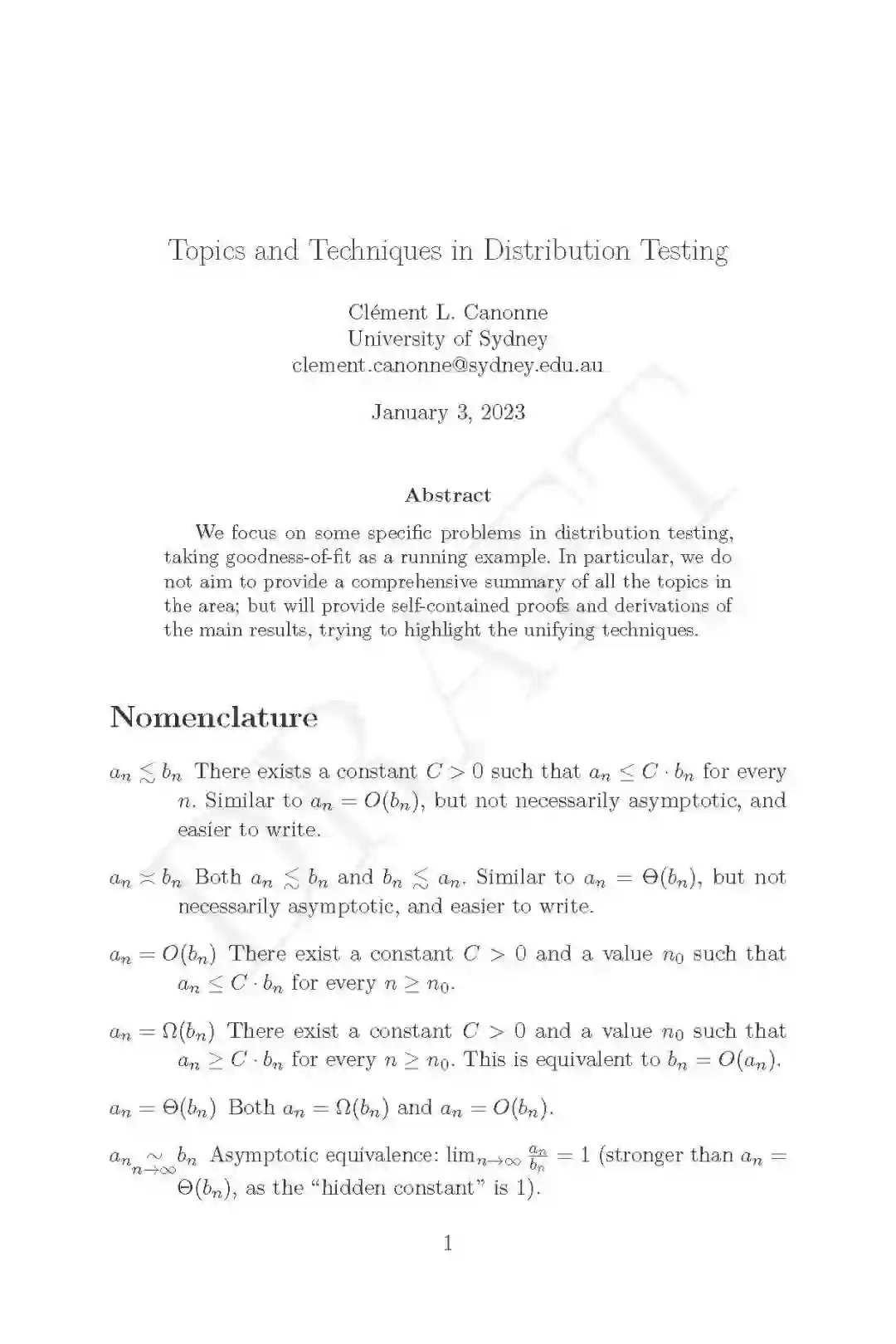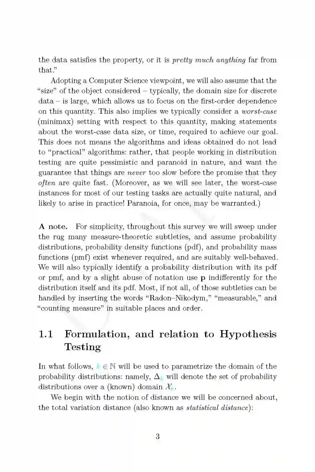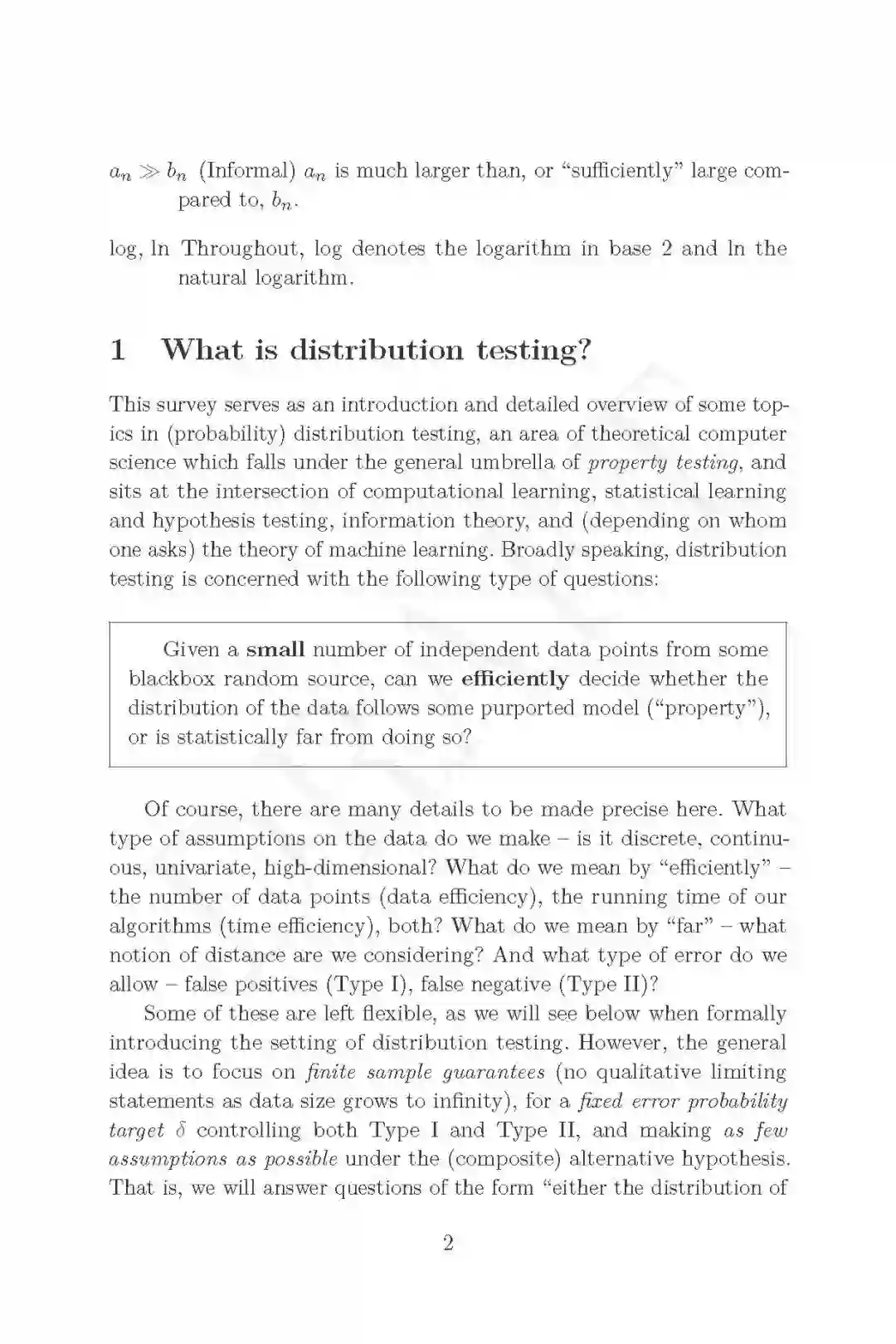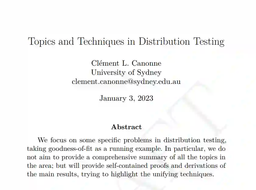 引用和转述第一章: 本综述是对分布测试中一些主题的介绍和详细概述,分布测试是理论计算机科学的一个领域,属于属性测试的范畴,位于计算学习、统计学习和假设测试、信息论和机器学习理论的交叉点。 关于这个主题,你可能还想阅读其他一些资源,首先是Ronitt Rubinfeld的这个简短的介绍性调查,或者是我自己的另一个调查。这本书与前几本书的不同之处在于:(1)更近;(2)更具体,专注于一个问题子集,并将它们作为指导示例,而不是描绘尽可能广泛的风景(但要从远处看);(3)更详细,包括证明和推导;当然,我不能保证我成功了;但这就是目的,结果由你来判断。