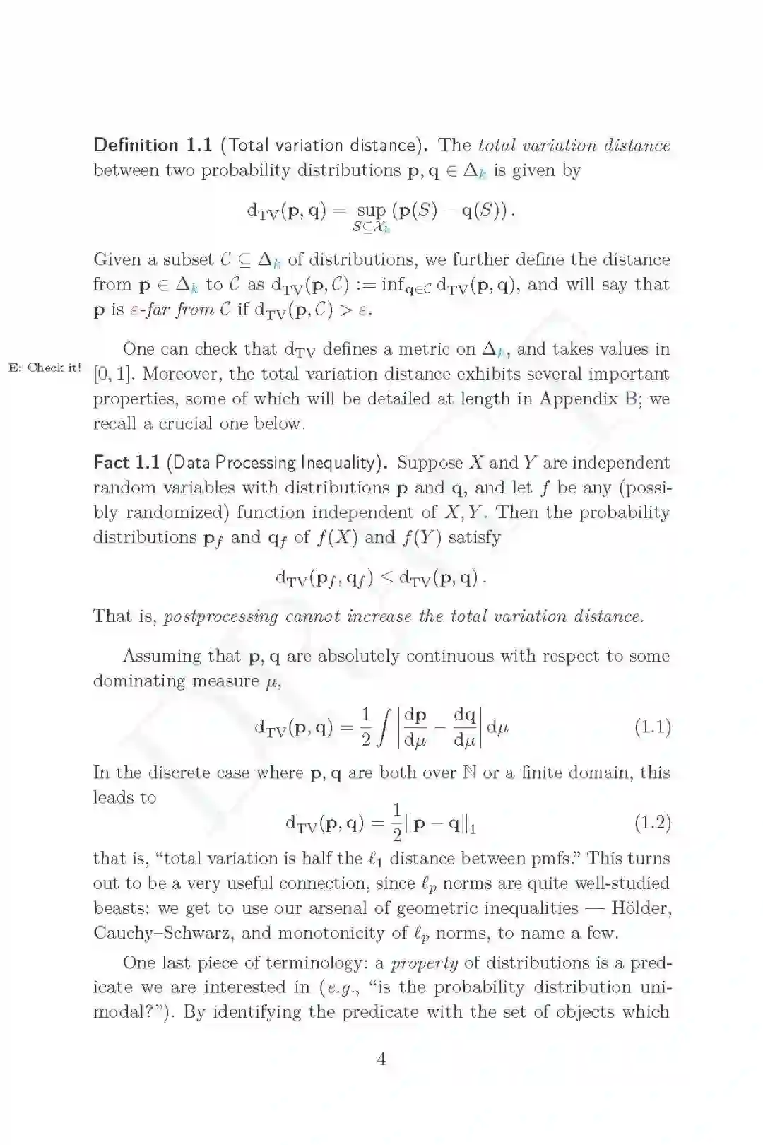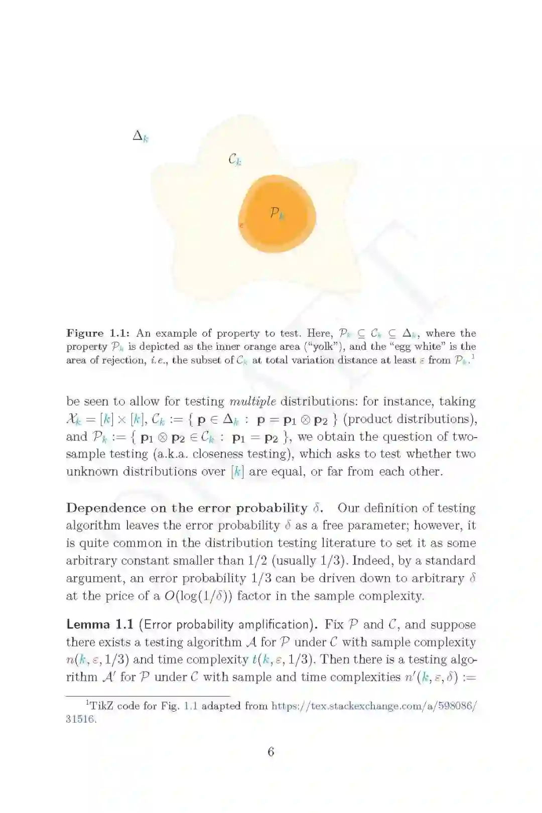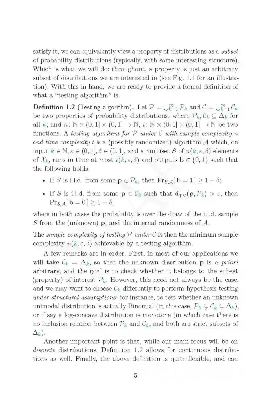 引用和转述第一章: 本综述是对分布测试中一些主题的介绍和详细概述,分布测试是理论计算机科学的一个领域,属于属性测试的范畴,位于计算学习、统计学习和假设测试、信息论和机器学习理论的交叉点。 关于这个主题,你可能还想阅读其他一些资源,首先是Ronitt Rubinfeld的这个简短的介绍性调查,或者是我自己的另一个调查。这本书与前几本书的不同之处在于:(1)更近;(2)更具体,专注于一个问题子集,并将它们作为指导示例,而不是描绘尽可能广泛的风景(但要从远处看);(3)更详细,包括证明和推导;当然,我不能保证我成功了;但这就是目的,结果由你来判断。