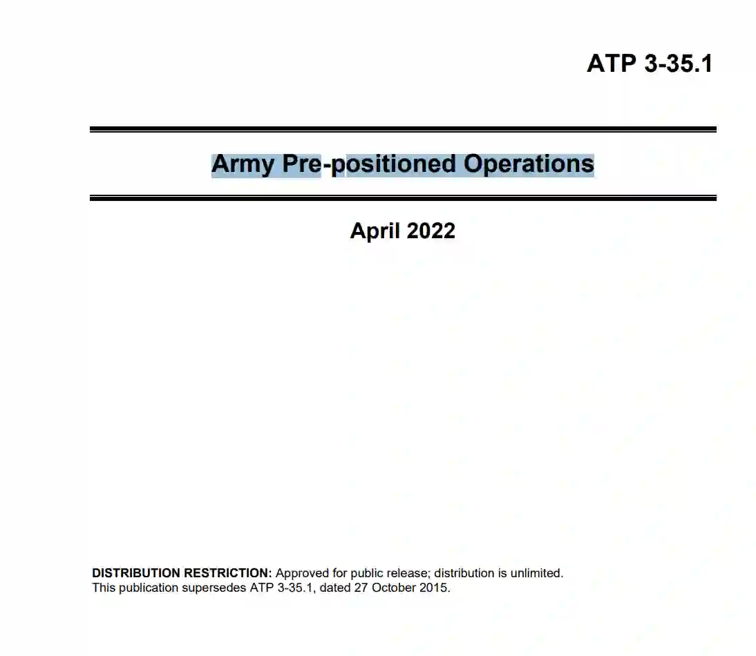 ATP 3-35.1 为各级指挥官及其参谋人员和部署部队提供了使用陆军预置库存(APS)支持兵力投送和作战指挥官的框架。陆军预先部署行动适用于各种军事行动,并支持 ADP 3-0 和 ADP 4-0 中的条令概念。