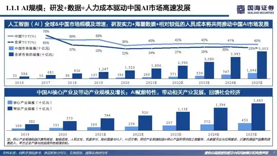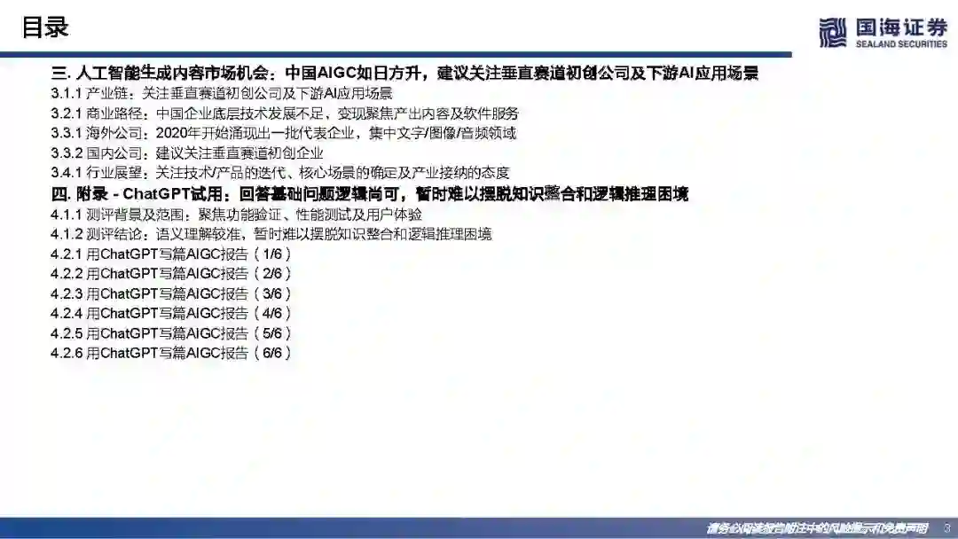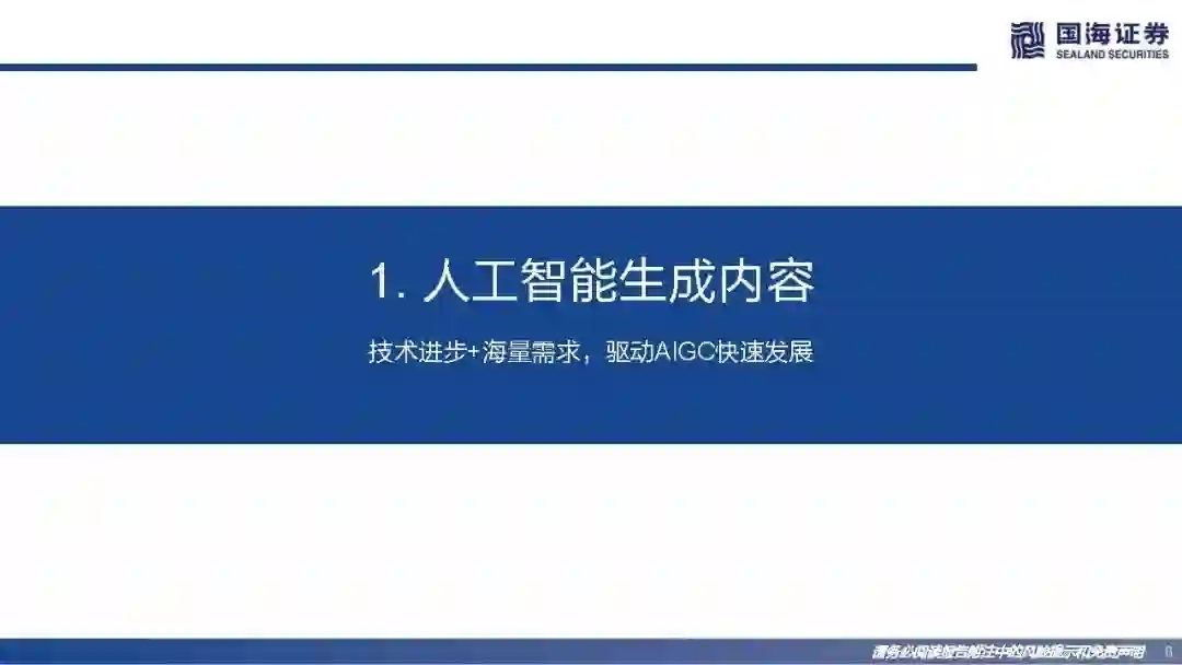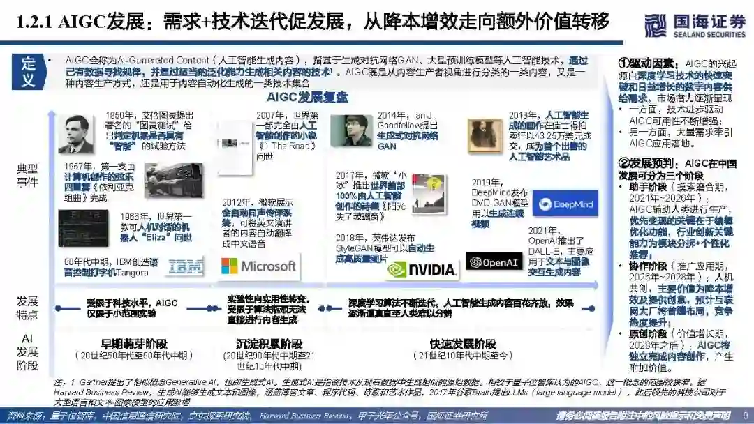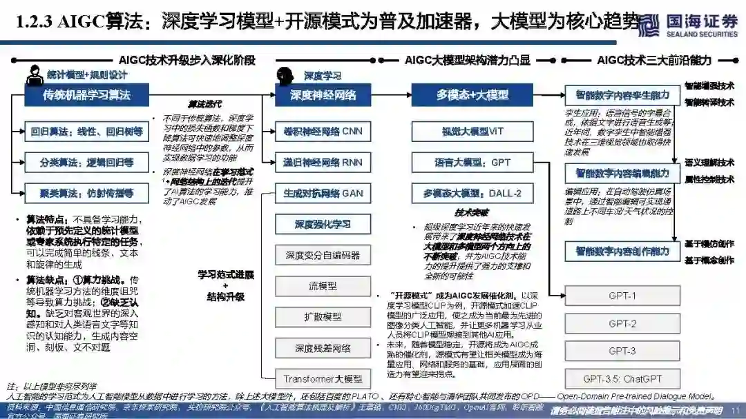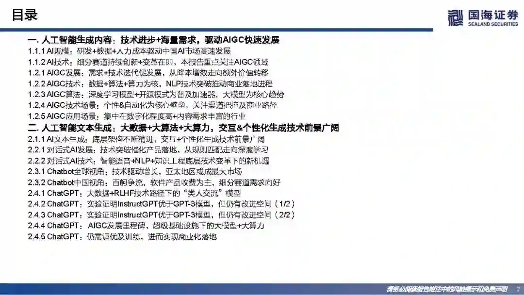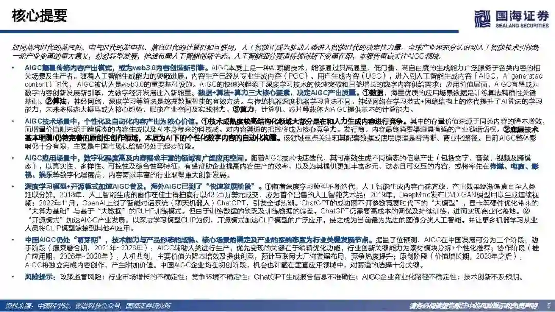 AIGC颠覆传统内容产出模式,或为web3.0内容创造新引擎。AIGC本质上是一种AI赋能技术,能够通过其高通量、低门槛、高自由度的生成能力广泛服务于各类内容的相关场景及生产者。随着人工智能生成能力的突破进展,内容生产已经从专业生成内容(PGC)、用户生成内容(UGC),进入到人工智能生成内容(AIGC,AI generated content)时代,AIGC被认为是web3.0的重要基础设施。AIGC的快速兴起源于深度学习技术的快速突破和日益增长的数字内容供给需求;应用价值层面,AIGC有望成为数字内容创新发展新引擎,为数字经济发展注入新能量。数据+算法+算力三大核心要素,决定AIGC产出质量。①数据,海量优质的应用场景数据是训练算法精确性关键基础。②算法,神经网络、深度学习等算法是挖掘数据智能的有效方法。与传统机器深度机器学习算法不同,神经网络在学习范式+网络结构上的迭代提升了AI算法的学习能力,未来多模态大模型或为核心趋势,赋能产业空间及实践潜力。③算力,计算机、芯片等载体为AIGC提供基本的计算能力。 AIGC技术场景中,个性化及自动化内容产出为核心价值。①技术成熟度较高结构化领域大部分是在和人力生成内容进行竞争。其中的存量价值来源于同类内容的降本增效,而增量价值则来源于跨模态的内容生成以及AI本身带来的科技感。对内容渠道的把控将成为核心竞争力。发行商、内容最终消费渠道具有强的产业链话语权。②底层技术基本明确/仍待完善的原创性创作领域,本质为AI下的个性化数字内容的自动化构建。该领域重点关注和其配套数据或底层原理是否清晰、商业化路径。目前AIGC整体影响仍十分有限,主要是中国市场供给端仍处于起步阶段。 AIGC应用场景中,数字化程度高及内容需求丰富的领域有广阔应用空间。随着AIGC技术快速迭代,其可高效生成不同模态的信息产出(包括文字、音频、视频及跨模态),以真实性、多样性、可控性及综合性等特征,有望帮助企业提高内容生产的效率,以及为其提供更加丰富多元、动态且可交互的内容,或将率先在传媒、电商、影视、娱乐等数字化程度高、内容需求丰富的行业取得重大创新发展。 深度学习模型+开源模式加速AIGC普及,海外AIGC已到了“快速发展阶段”。①随着深度学习模型不断迭代,人工智能生成内容百花齐放,产出效果逐渐逼真直至人类难以分辨。2018年,人工智能生成的画作在佳士得拍卖行以43.25万美元成交,成为首个出售的人工智能艺术品;2019年,DeepMind发布DVD-GAN模型用以生成连续视频;2022年11月,OpenAI上线了智能对话系统(聊天机器人)ChatGPT,引发全球热潮。ChatGPT的成功离不开参数竞赛时代下的“大模型”,显卡等硬件优化带来的“大算力基础”与基于“大数据”的RLHF训练模式。但由于训练数据的缺乏及训练数据的偏差,ChatGPT仍需要高成本的调优及持续训练,进而实现商业化落地。②“开源模式”加速AIGC产业发展。以深度学习模型CLIP为例,开源模式加速CLIP模型的广泛应用,使之成为当前最为先进的图像分类人工智能,并让更多机器学习从业人员将CLIP模型嫁接到其他AI应用。 中国AIGC仍处“萌芽期”,技术能力与产品形态的成熟、核心场景的确定及产业的接纳态度为行业关键发展节点。据量子位预测,AIGC在中国发展可分为三个阶段:助手阶段(摸索磨合期,2021年~2026年):AIGC辅助人类进行生产,优先变现的关键在于编辑优化功能,行业创新关键能力为素材模块分拆+个性化推荐;协作阶段(推广应用期,2026年~2028年):人机共创,主要价值为降本增效及提供创意,预计互联网大厂将普遍布局,竞争热度提升;原创阶段(价值增长期,2028年之后):AIGC将独立完成内容创作,产生附加价值。中国AIGC企业均在初创阶段,机会也许藏在垂直应用领域中,对赛道的选择十分关键。