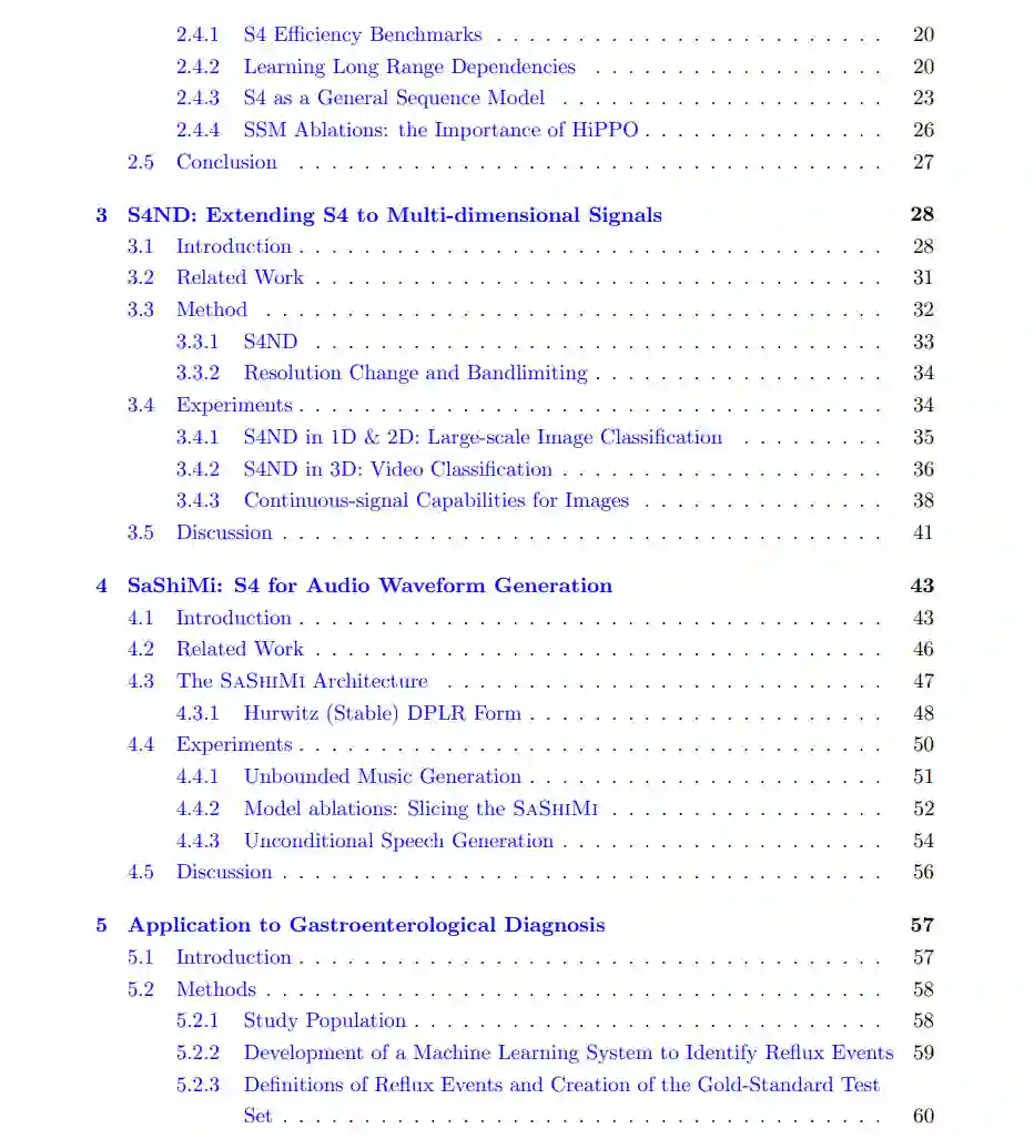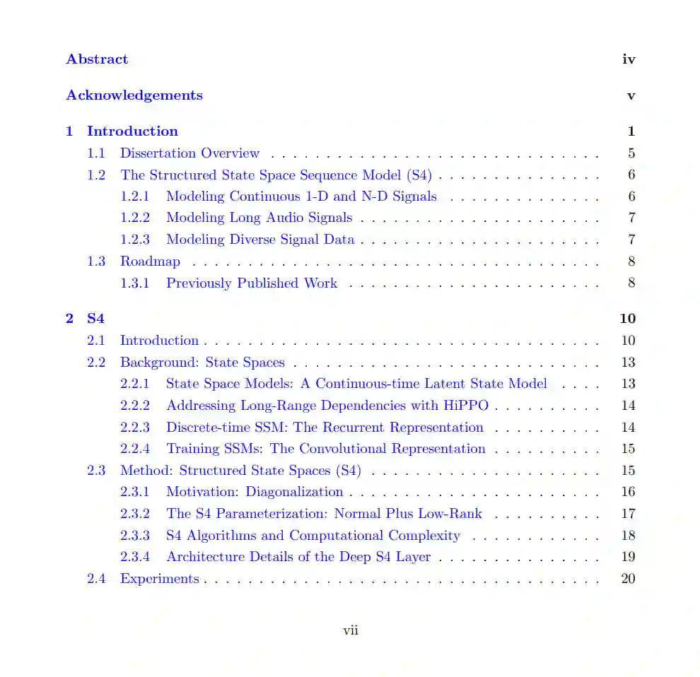 本论文开发了一套新的方法,用于使用状态空间模型对信号数据进行建模。首先,我们介绍了一种叫做S4的状态空间序列模型,作为建模信号数据的通用基础构件。其次,我们将这种建模层推广到像图像和视频这样的多维信号,产生了第一个在如ImageNet这样的大规模基准测试上的连续信号状态-of-the-art模型。接下来,我们展示了如何将S4整合到一个多尺度架构中,这使得模型能够处理极长序列的音频,包括之前未解决的关于无条件自回归生成原始音频样本的任务。最后,我们证明了状态空间建模方法对各种信号数据的广泛适用性,包括在诊断胃食管反流病中使用的阻抗传感器数据的一个真实世界应用。综合起来,这套新的方法提供了一套用于建模多样化、多维信号的通用且多功能的基础构件。