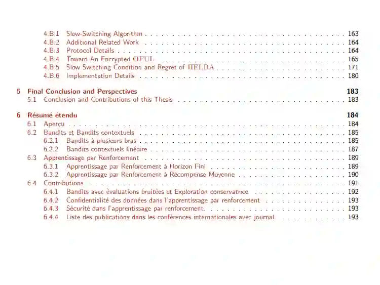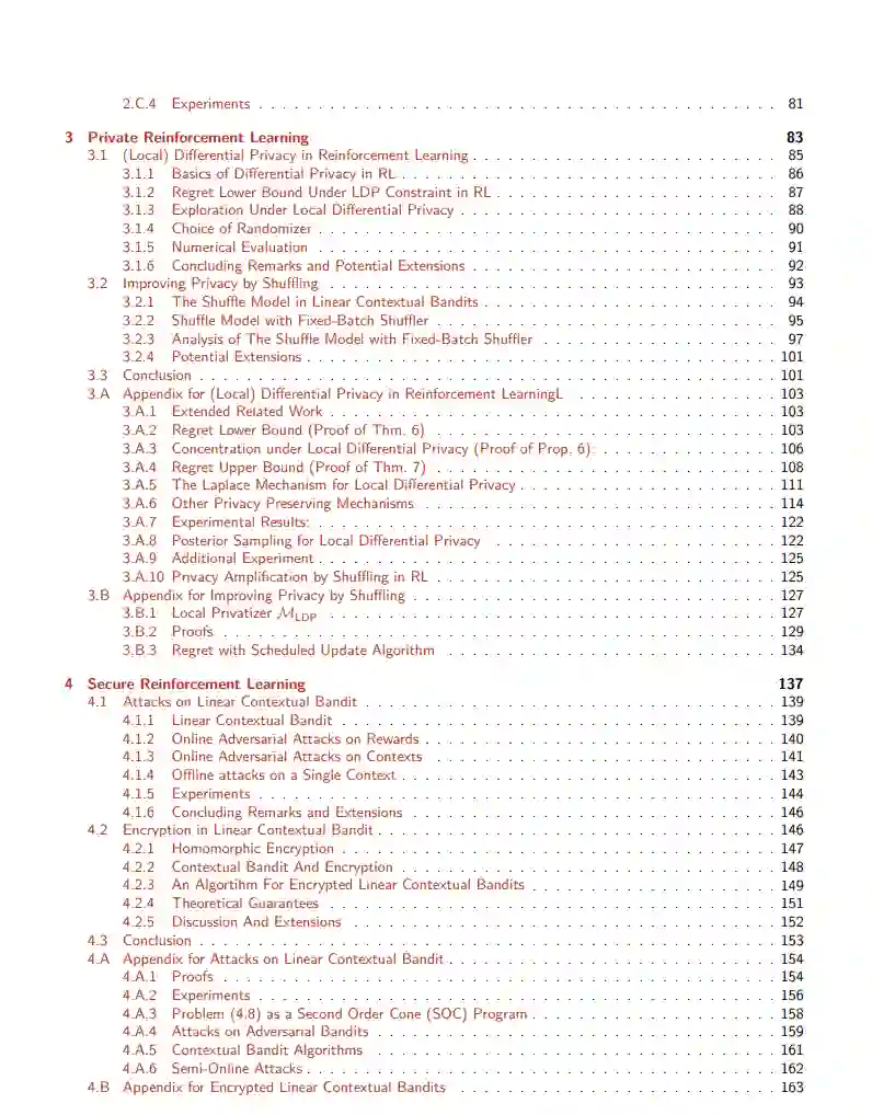 最后,我们考虑强化学习系统的安全问题。一个方面是了解对抗性攻击如何影响RL系统。在许多领域,恶意代理可能有动机强迫一个多臂老虎机算法进入所需的行为。例如,一个不道德的广告发布者可能会试图增加他们自己的收入,而不考虑广告商;一个卖家可能想要增加他们产品的曝光,或者挫败一个竞争对手的广告活动。我们表明,一个恶意代理可以在T步的时间范围内,通过对奖励或背景进行对抗性修改,强制多臂老虎机算法推荐任何所需的项目T ≠ o(T)次,而累积成本只是对数增长。RL的第二个安全方面是构建一个端到端加密的RL系统。事实上,多臂老虎机方法的一个关键方面是,它们需要观察上下文-即个体或团体级数据-和奖励,以解决连续的问题。在工业应用中的部署增加了对保护用户数据安全的方法的兴趣。我们引入了一个基于同态加密的安全多臂老虎机框架,允许使用加密数据进行计算。该算法只观察加密的信息(上下文和奖励)并没有解密的能力。从RL算法中的数据的安全性是保证的。
