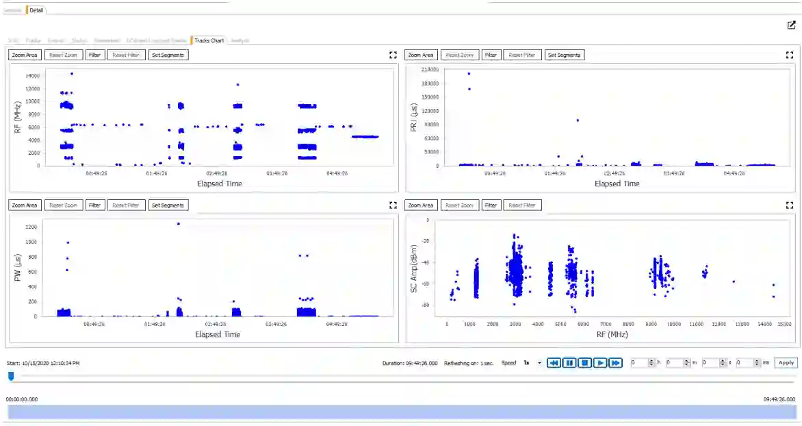 准确的信号分析和根据操作者选择的标准呈现发射器的活动,指纹和发射识别(脉冲分析-内部和内部)。