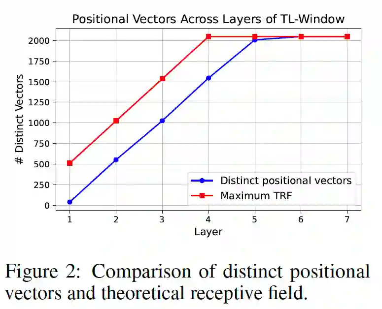 对于基于窗口注意力的模型,具有相同最大感受野(窗口大小层数)的位置共享相同的位置向量。因此,我们提出了“独特位置向量”的概念,讨论上下文窗口内究竟有多少个独特的位置向量。在此,我们选择 0.99 作为阈值,将所有与后续位置的位置向量的余弦相似度大于该阈值的设定为独特位置向量。如下图所示,我们统计了不同层中独特位置向量的数量。与完整注意力机制类似,第一层仅有前几个词元拥有独特的位置向量。然而,随着层数的增加,越来越多的位置从前到后表现出独特的位置信息,且增加速度大致与窗口大小一致。这表明类似的位置信息流动在窗口注意力机制中同样发生,且随着层数和窗口的传递表现得愈加明显。