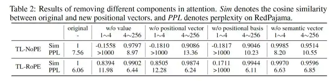 可以发现,当删除中间词元的语义向量时,模型的位置信息向量和困惑度几乎没有变化。然而,当删除最初几个词元的位置信息向量和位置偏置时,模型性能显著下降。这表明最初词元的位置信息向量作为锚点,其信息流动促进了后续词元位置信息的形成。