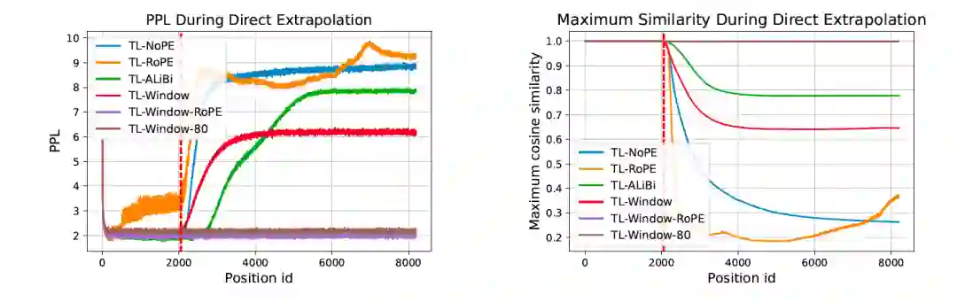 我们首先测试了不同模型在直接外推情况下的表现,重点分析了长度外推(即困惑度保持稳定)与位置向量的关系。我们测量了模型在更长文本下的困惑度变化,并比较了窗口内外位置向量的相似度。结果表明,无论采用何种位置编码或注意力机制,只要保持位置向量的稳定性,就可以实现长度外推。