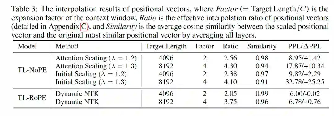 为探究上下文窗口拓展为何能够免训练地避免性能下降,我们深入分析了位置向量的变化情况,对比了拓展前后计算出的位置信息。正如下表所示,上下文窗口拓展后,位置向量出现了显著的内插现象,且内插比例与模型的上下文窗口扩展比例基本一致。 进一步研究发现,基于初始位置的信息流动促进位置信息形成的原理,以及注意力放缩方法,我们仅对首词元的注意力值进行了控制(Initial scaling)。结果表明,仅对首位置进行放缩就能实现与全词元放缩相近的效果。这表明位置向量的放缩主要通过调整首词元的信息流动来实现。