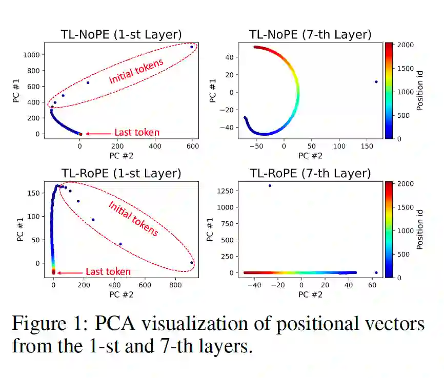 对于使用完整注意力机制的模型,我们首先从各层的隐状态中提取位置向量,并通过PCA进行可视化。下图展示了基于RoPE和NoPE模型的第一层和第七层的PCA结果。可以看出,在经过第一层后,初始词元的位置信息已经开始展现出独特的特征,而后续词元的位置区分并不明显。然而,经过多层处理后,不同位置的词元逐渐呈现出各自独特的位置信息。