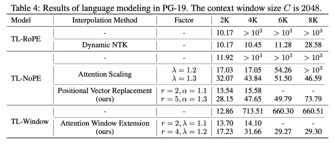 从结果中可以看出,无论是针对 NoPE 模型的位置信息向量替换,还是针对使用窗口注意力的注意力窗口扩展方法,都能有效扩展模型的上下文窗口,避免了直接外推导致的严重性能损失。同时,我们的方法在效果上与之前的一些方法相媲美。
