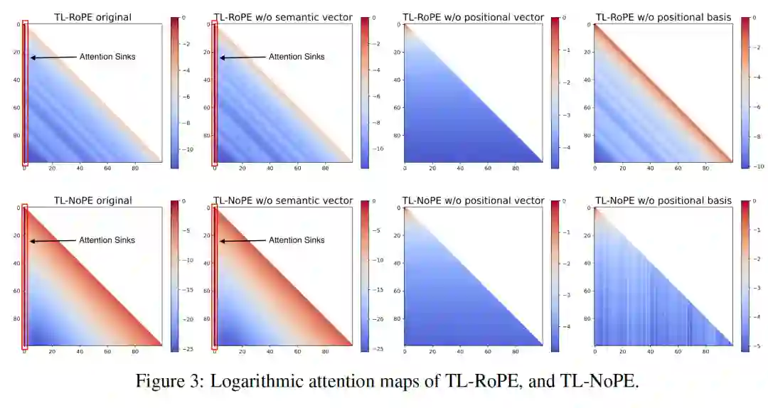 我们对选定注意力头的前100个位置进行了多次采样,并对其注意力值取平均,生成的注意力热力图如上所示。可以看到,删除位置信息后,主要出现了以下变化: * 模型失去了注意力汇(attention sinks)的特点,即前几个词元不再占据大部分注意力。 * 注意力的长期衰减特性消失了,即随相对距离增加,注意力值逐渐减小的趋势不再存在。