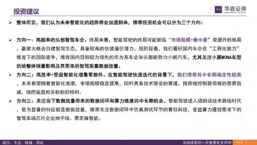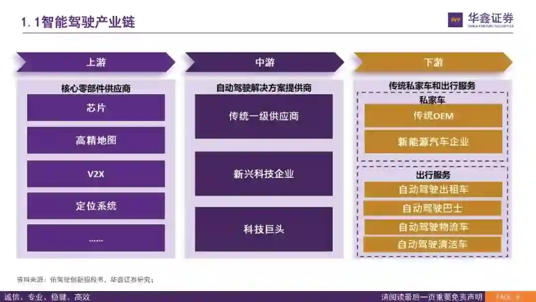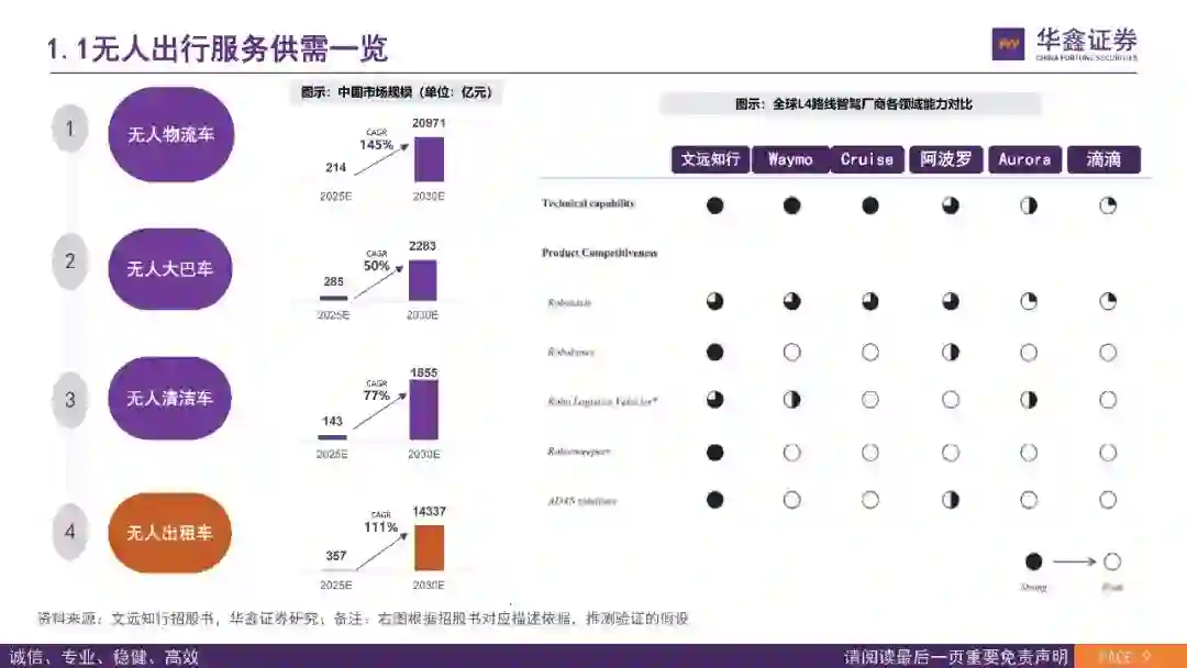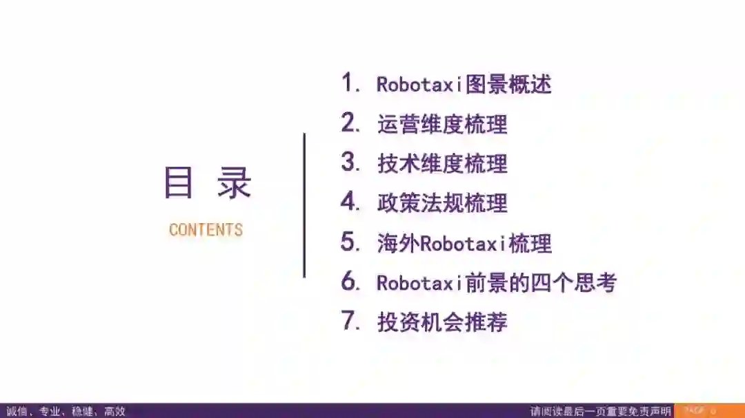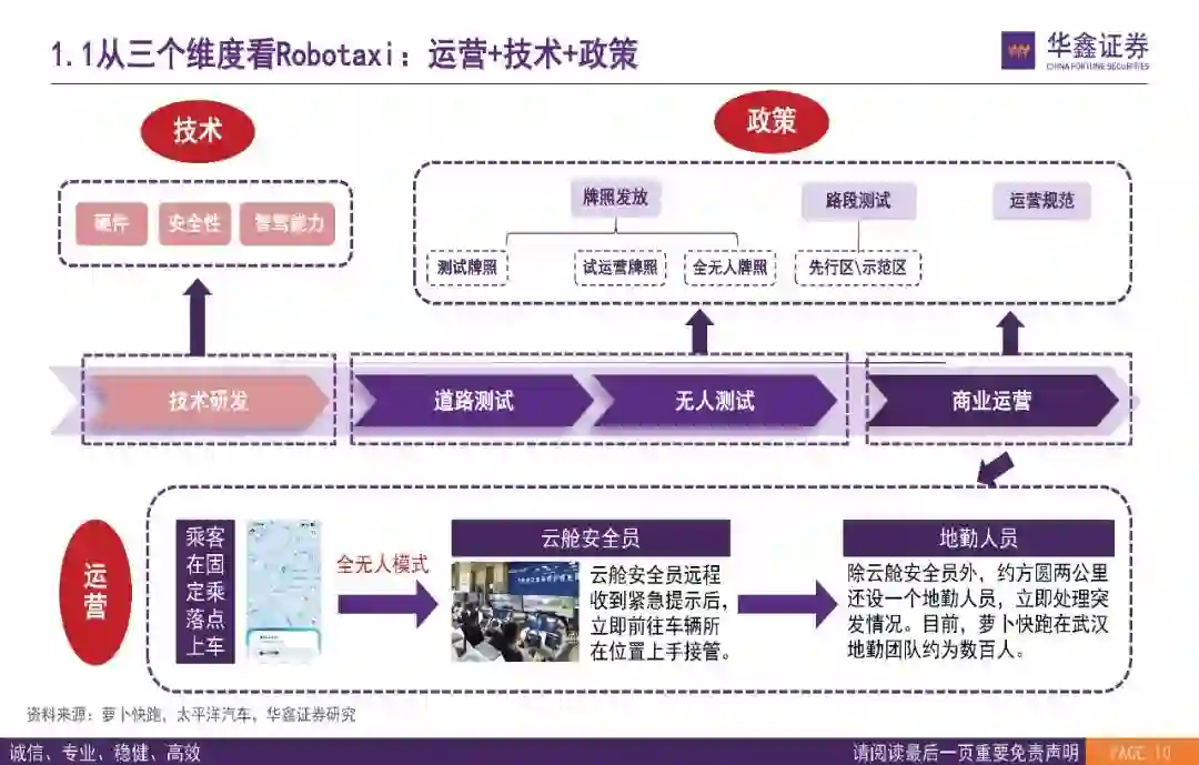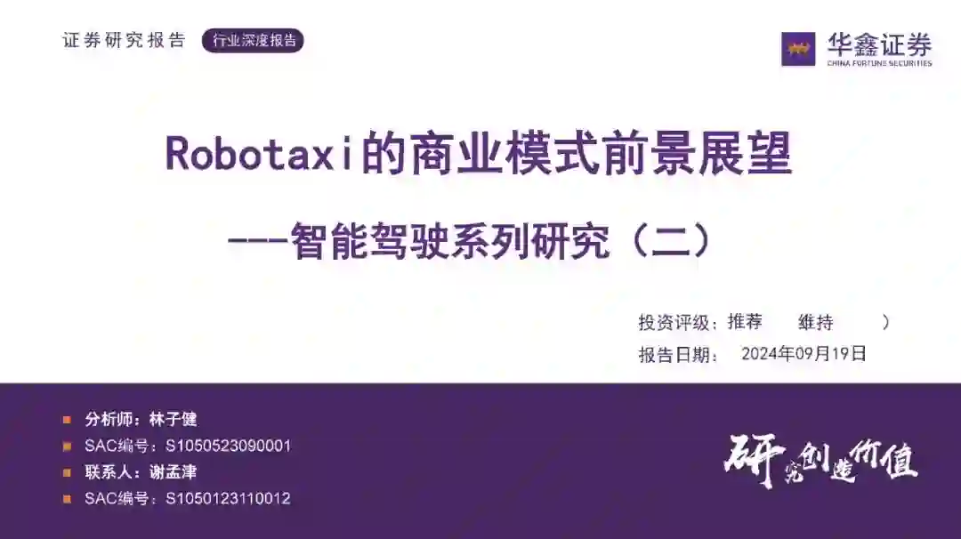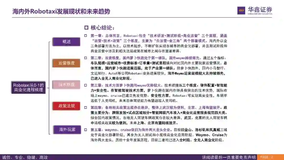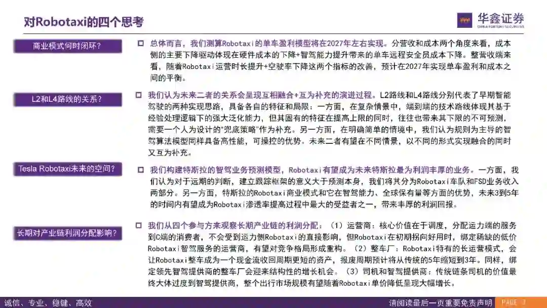 第一章:总体而言,Robotaxi包含“技术研发+测试阶段+商业运营”三个流程,涵盖“运营+技术+政策”三个维度,主要为“自运营+金三角”两个部署模式。海内外以金三角部署方法为主,以技术起步,不断扩张实现各城市的商业化部署,并且测试阶段和商业运营中涉及到相关法规政策在城市之间存在显著差异。 第二章:运营维度,国内萝卜快跑处于第一梯队,国外waymo持续领先。通过五个指标:车队规模+运营城市+收费标准+订单量+测试里程横向对比国内外主要玩家运营情况。总体而言,国内萝卜快跑进展迅猛,处于产业第一梯队。除萝卜快跑外,国内小马智行、文远知行、AutoX等公司Robotaxi业务进展较快,海外Waymo运营规模较大且持续领先,已进入全无人商业化阶段。 第三章:技术方面萝卜快跑与waymo优势较大。技术端提炼三个维度:硬件配置+智驾能力+安全性。在智能驾驶技术方面,萝卜快跑在国内市场具有突出的技术优势,国际市场上waymo、cruise已建立先发优势。安全性方面,Robotaxi可实现高安全性,车祸率远低于人类司机,未来总体驾驶能力有望超越人类司机。 第四章:各地相关政策法规存在差异,整体上武汉较为便利,北京、上海有望放开。政策主要分为:牌照发放+试点区域划分+智能网联汽车准入+商业化运营服务规范四大类。综合国内政策情况,各地无人驾驶车辆政策存在较大差异,武汉、北京的无人驾驶车辆申请相关政策较为便利,未来上海、北京有望陆续放开。 第五章:waymo、cruise依旧为海外两大龙头企业。目前旧金山、洛杉矶和凤凰城三城处于商业化部署阶段,其余为无人测试和小规模商业化应用阶段。Waymo、Cruise为海外两大龙头,历经十余年发展历程,目前二者均已进入全时段、全无人商业化阶段。 总体而言,我们测算Robotaxi的单车盈利模型将在2027年左右实现。分营收和成本两个角度来看,成本侧的主要下降驱动体现在硬件成本的下降+智驾能力提升带来的单车远程安全员成本下降。整营收端来看,随着Robotaxi运营时长提升+空驶率下降这两个指标的改善,预计在2027年实现单车盈利和成本之间的平衡。 我们认为未来二者的关系会呈现互相融合+互为补充的演进过程。L2路线和L4路线分别代表了早期智能驾驶的两种实现思路,具备各自的特征和局限:一方面,在复杂情景中,端到端的技术路线体现其基于经验处理逻辑下的强大泛化能力,但其固有的特征在提高上限的同时,往往也带来其下限的不可预测,需要一个人为设计的“兜底策略”作为补充。另一方面,在明确简单的情境中,我们认为规则为主导的智驾算法模型同样具备高性能,可操控的优势。未来二者有望在不同情景,以不同的形式实现融合的同时又互为补充。 我们构建特斯拉的智驾业务预测模型,Robotaxi有望成为未来特斯拉最为利润丰厚的业务。一方面,我们认为对于远期的判断,建立跟踪框架的意义大于预测本身,我们将其分为Robotaxi车队和FSD业务收入两部分。另一方面,特斯拉的Robotaxi商业模式和它在智驾能力、全球保有量等方面的优势,未来3到5年的时间内有望成为Robotaxi渗透率提高过程中最大的受益者之一,带来丰厚的利润回报。 我们从四个参与方来观察长期产业链的利润分配:(1)运营商:核心价值在于调度,分配运力端的服务到C端的消费者,不会受到运力侧Robotaxi的直接影响,但Robotaxi在初期拐向好用时,绑定稀缺的低价Robotaxi智驾服务的运营商,有望对竞争格局形成重构。(2)整车厂:Robotaxi特有的长运营模式,会让Robotaxi整车成为一个现金流收回周期更短的资产,报废周期预计将从传统的5年缩短到3年。同样,绑定领先智驾提供商的整车厂会迎来结构性的增长机会。(3)司机和智驾提供商:传统链条司机的价值最终大体过度到智驾提供商,整个出行市场规模有望随着Robotaxi单价降低呈现大幅增长。