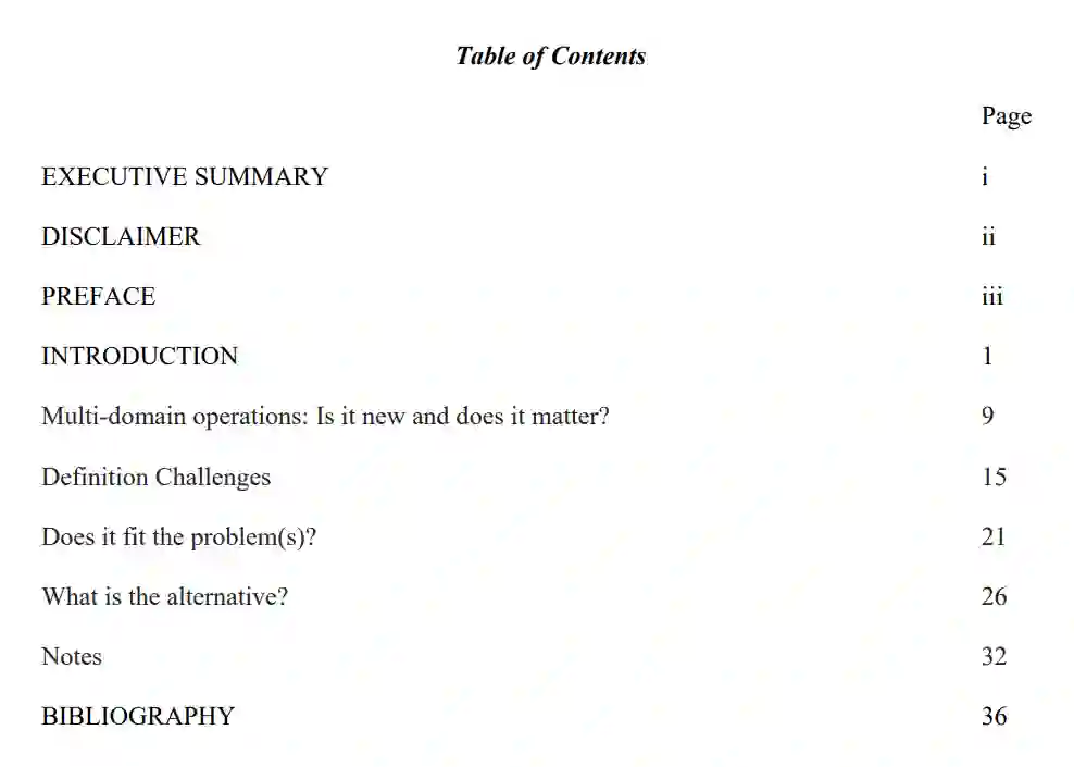 为多域作战提供一个激烈的理论解决方案既无法实现,也没有必要。允许思想上的模糊性提供了机会,使各部门能够保持主要领域的主导地位,这对于多领域合作和跨领域的成功来说是必要的。它还允许制定与特定情况相关的解决方案,利用创造力,而没有在零和资源环境中进行资源竞争的风险。各部门之间的同步性可以通过更加集中和一致的语言来克服,并通过使用现有的基础设施来实施变革而不产生重大动荡,使美国的军事优势保持不变,并能够确保美国持续的全球力量投射。