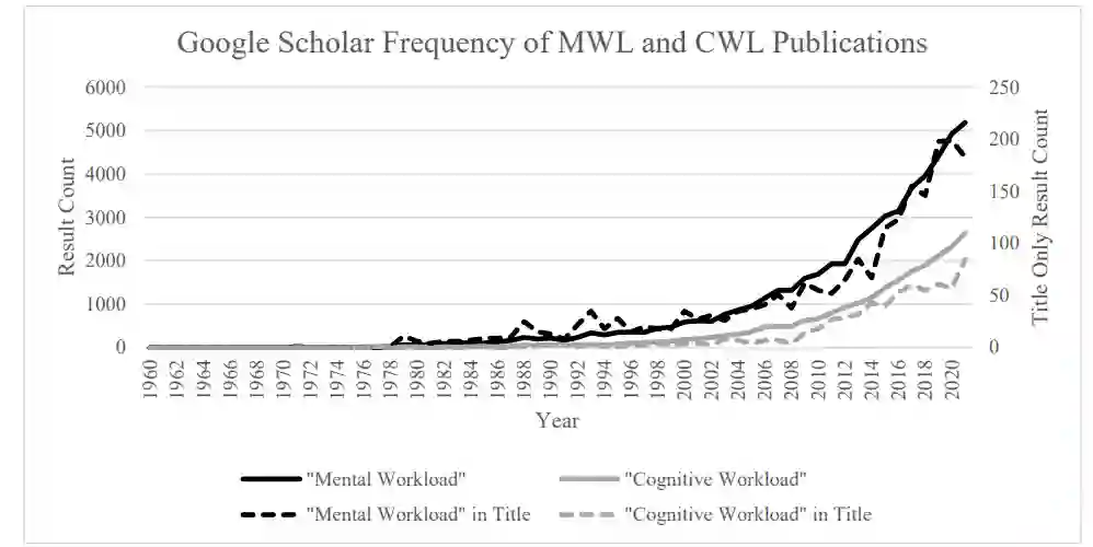 为了消除任何混淆点,请注意Van Acker等人(2018)使用了 "心理负荷"(MWL)一词,而我们在本评论中使用的是 "认知负荷"。有关评估认知工作需求导致的认知资源支出的文献,已经交替使用了这两个术语(即心理和认知)(甚至有时在同一篇论文中交替使用)。图1详细说明了几十年来每个术语的使用情况;"心理负荷 "一词在文献中出现的时间较早(Westbrook等人,1966年),比 "认知负荷 "使用的频率更高。在USAARL进行的工作中,已经采用了 "认知负荷 "这一术语。