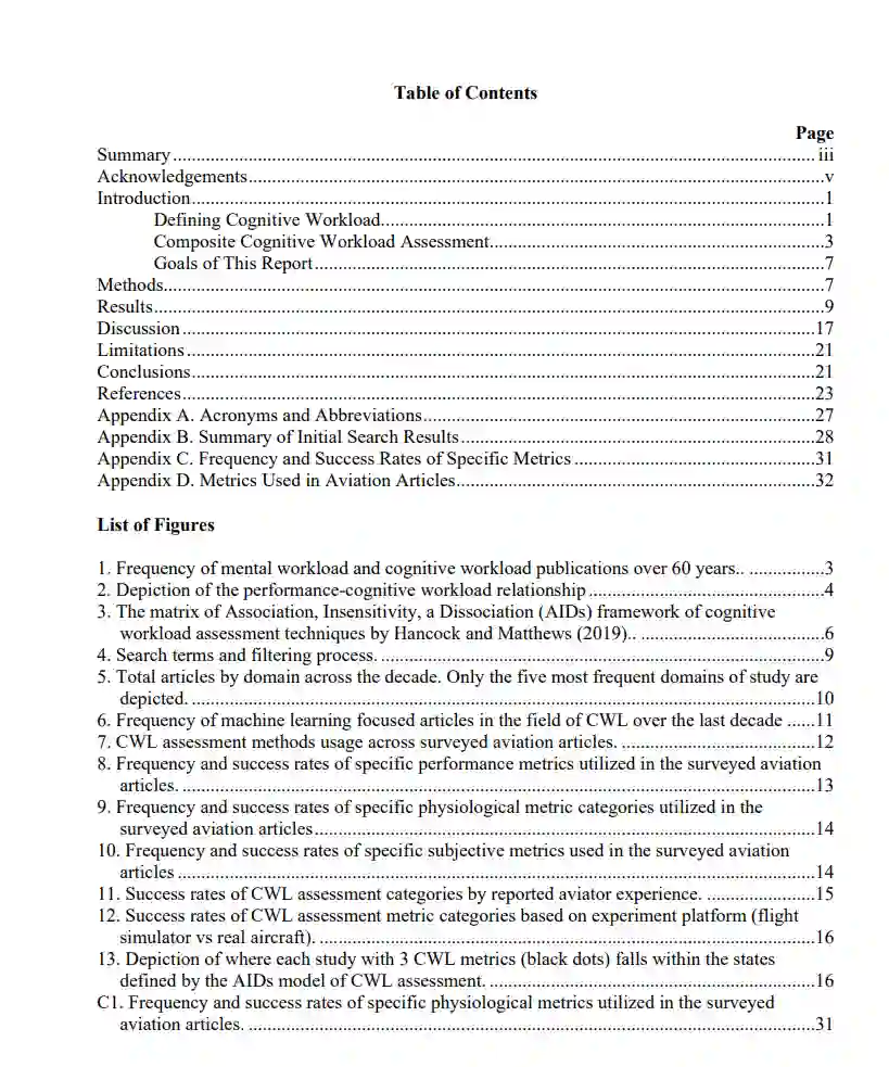 本报告研究了过去十年(2010年代)的CWL文献,以扩展Young等人(2015)报告的趋势。为了指导USAARL正在进行的CWL研究的发展,对航空领域的复合CWL评估文献进行了重点搜索。旋转翼和固定翼航空平台都包括在搜索范围内。从这些航空文章中,报告了不同CWL指标的使用频率和成功率。同时还研究了作为个体差异(即飞行经验)和研究平台(即模拟器或飞机)功能的CWL评估的差异数据。最后,通过CWL评估的AIDs模型对综合CWL指标的结果进行了研究。