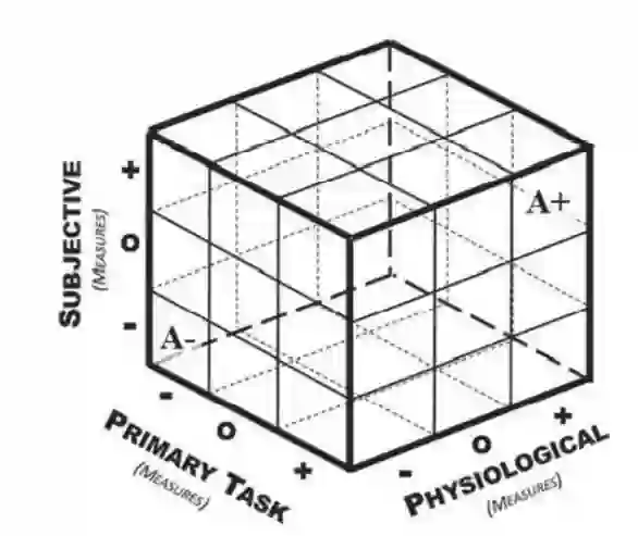 图3. Hancock和Matthews(2019)的认知负荷评估技术的关联、不敏感和分离(AID)框架矩阵。每项措施都可以表明认知负荷反应的增加(+)、减少(-)或稳定(O)。由于每个状态都由矩阵中的一个立方体表示,跨越性能(主要任务)、生理学和主观测量的27种结果组合是可能的。当测量结果相互一致时(即所有测量结果都显示认知负荷减少或增加),就会出现双重关联(用A-表示减少,用A+表示增加)。