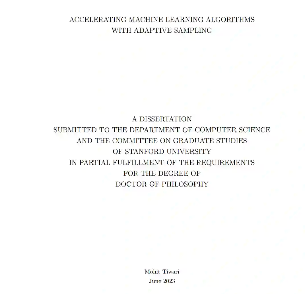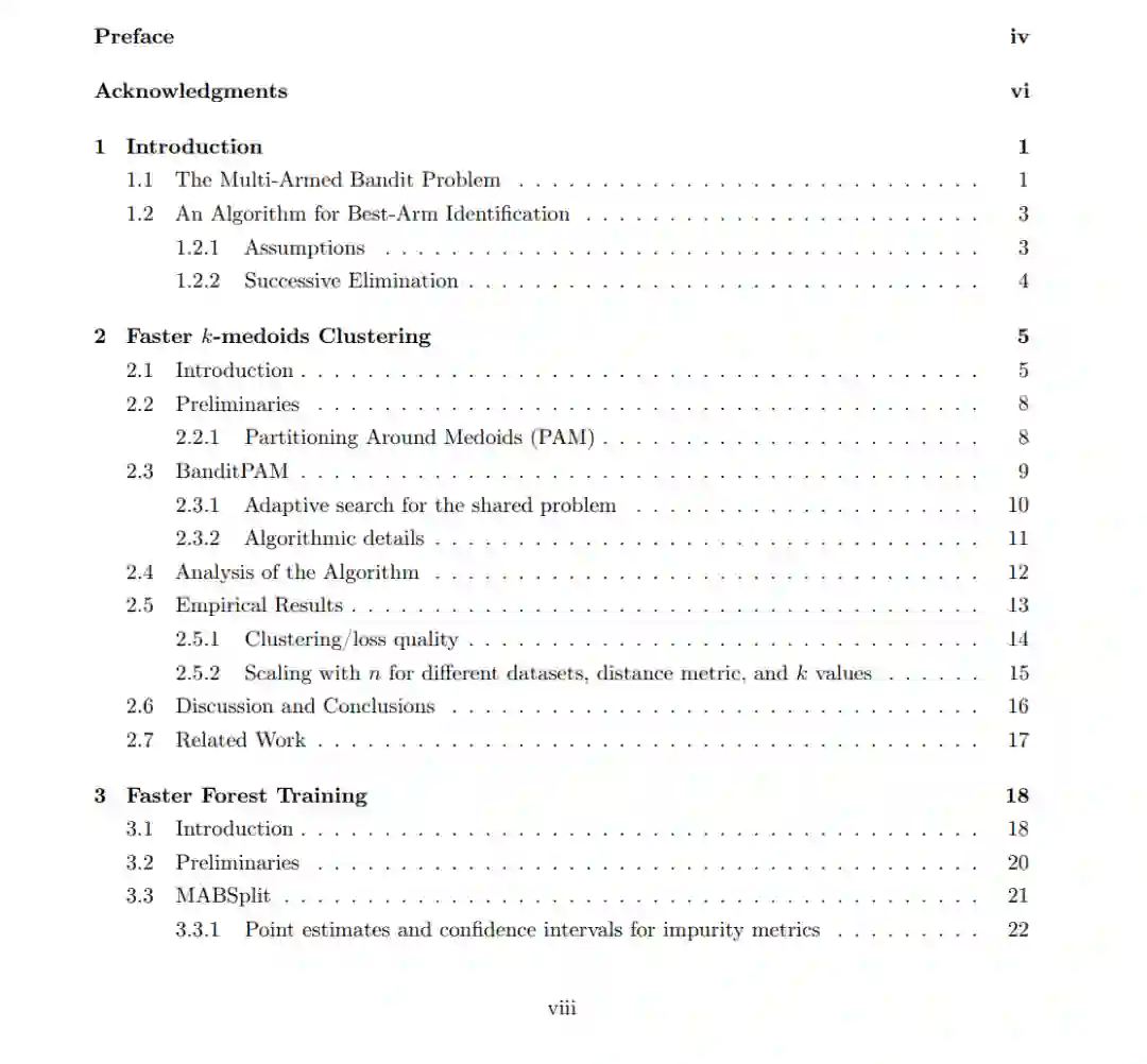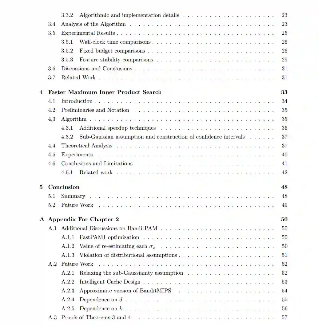 在第3章中,我们分析了训练基于树的模型的问题。这类模型的大部分训练时间都用在分割树的每个节点上,即确定在哪个特征和相应的阈值处分割每个节点。我们展示了节点分割子程序可以简化为一个最佳臂识别问题,并介绍了一种训练树的最新算法。我们的算法仅依赖于每个可能分割的相对质量,而不是显式地依赖于训练数据集的大小,并将数据集大小n的显式依赖从常用的先前算法的O(n)降低到O(1)。我们的算法通常适用于许多基于树的模型,如随机森林和XGBoost。在第4章中,我们研究最大内积搜索问题。我们注意到,与k-medoids和节点分割问题一样,最大内积搜索问题可以简化为一个最佳臂识别问题。有了这个观察,我们为高维数据集中的最大内积搜索问题提出了一个新颖的算法。在对数据的合理假设下,我们的算法将与数据集维数d的显式比例从O(√d)降低到O(1)。我们的算法具有几个优点:它不需要对数据进行预处理,能自然处理新增或删除的数据点,并包含一个超参数来权衡准确性和效率。第5章以总结本论文的贡献和未来工作的可能方向作为结论。