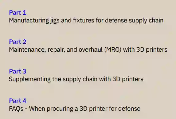现代武器系统与技术效能远超往昔,使更少作战人员即可达成同等战略效果。同时,高性能复杂技术需训练有素的技术人员实施全面预防性维护以维持战备状态——即使在和平时期亦如此。除军队保障体系外,私营工业部门在武器技术研发制造、升级维护环节提供广泛支持。在研发、制造、维护与物流高度聚焦的背景下,3D打印机成为防务承包商与国防单位的关键工具实属必然。本指南将阐述3D打印在军事防务的核心应用场景,解析其技术价值,并概述典型采购路径。