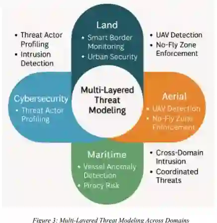 随着全球安全态势日益复杂多变,在物理与数字领域探测、解读并应对不断演变的威胁向量能力已变得至关重要。传统的监控与风险评估系统往往相互孤立、被动响应,且无法处理实时态势感知所需数据的海量性、多样性和高速性。随着网络战、非对称威胁及陆海空动能作战的融合,由人工智能(AI)赋能的集成监控分析技术提供了一种变革性解决方案。本研究探讨一种综合性AI增强威胁建模框架,该框架可同步多领域监控数据流以实现预测性情报与实时响应。它提出一种统一架构,利用机器学习算法、计算机视觉和自然语言处理(NLP)来识别异常行为、检测意图,并跨网络入侵、空中入侵、海上侵权和地面威胁建模风险轨迹。通过融合来自卫星、无人机、雷达、声纳(SONAR)和数字遥测的传感器数据,该系统构建出能够进行早期预警和先发制人式缓解的整体威胁图景。本文进一步审视了特定领域用例,例如边境安全中AI驱动的无人空中监控、用于网络威胁行为者画像的行为分析,以及用于自主海上异常检测的深度学习技术。验证工作得到跨领域数据集和经过压力测试的仿真环境支持,以对标性能、准确性和响应延迟。在威胁具有流动性和多维性的时代,该方法为国防机构、政策制定者和关键基础设施运营商提供了可操作的见解,通过智能的、领域感知的监控集成确保稳健的威胁预期和系统韧性。