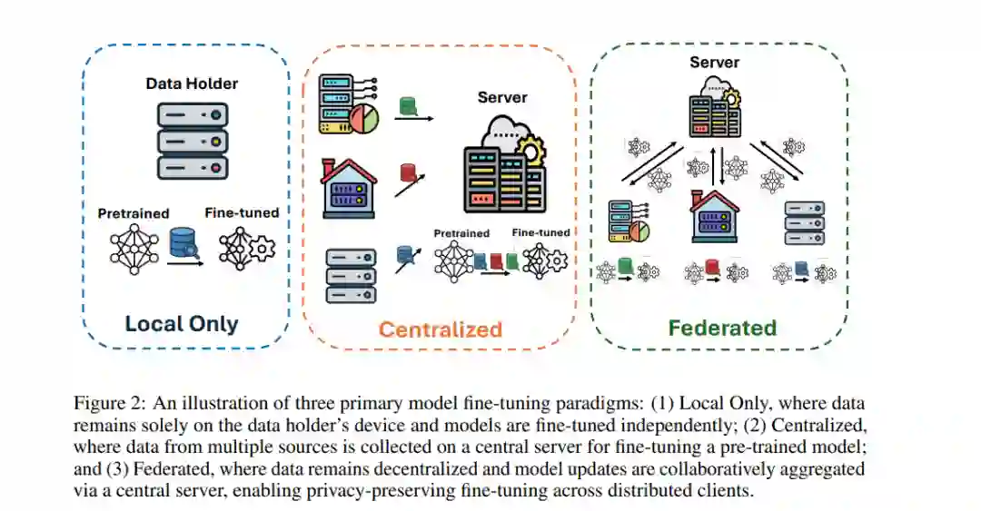 尽管PEFT方法在计算资源上具有显著优势,但为了有效适配具体的下游任务,仍需大量数据 [42]。然而,单一实体所拥有的数据往往难以满足这一需求,这就需要多个数据拥有者之间进行合作,共同利用分散的数据资源。在这种多方协作的场景下,隐私问题随之而来,因为多方微调过程中可能泄露敏感信息。在法律、医疗和金融等高度敏感的数据领域,隐私问题尤为关键 [33],因此必须实施严格的隐私保护机制。 联邦学习(Federated Learning,FL)[79] 提供了一种可行的解决方案,它允许在不直接共享原始数据的前提下进行协同模型微调。FL使得多个参与方能够在保障数据隐私的同时,参与模型的适配过程,从而有效应对上述挑战。 鉴于将PEFT与基础模型融合于FL框架中具有显著优势,已有大量研究开始探索这一方向 [112, 128]。这些工作采用不同的PEFT方法,在FL环境中对各类基础模型进行微调。尽管如此,将PEFT引入FL环境也带来了新的挑战,如数据异质性、可扩展性、计算约束和通信开销。针对这些挑战,研究者已提出了多种解决方案。 随着该领域研究的不断深入,系统性综述显得尤为重要。虽然已有若干综述探讨了基础模型在联邦学习中的应用,但尚无工作专门聚焦于FL中的PEFT,并涵盖最新进展。例如,[14, 119] 主要研究FL中基础模型的隐私保护机制,[117, 132] 探讨了基础模型在FL中的未来发展方向;而[64] 虽然对基础模型与FL的结合做出了较全面的综述(包括对PEFT的讨论),但由于发布时间较早,未能涵盖大量近期发布的FL-PEFT方法。 为填补这一空白,本文系统性地回顾了联邦学习环境下的参数高效微调研究。我们基于PEFT方法类别和应用任务,对现有工作进行了分类和梳理,涵盖自然语言处理与计算机视觉等多个方向。 本文的组织结构如下:第二部分介绍联邦学习的基本概念、核心原理、常见挑战及PEFT的基础知识;第三部分基于[42]提出的分类方法,对在FL中应用的PEFT方法进行分类和分析:3.1节探讨加性PEFT方法,即引入新权重参数或修改激活函数;3.2节研究选择性PEFT方法,即只微调部分已有参数;3.3节聚焦于重参数化PEFT方法,如LoRA及其变种在FL中的应用。第四部分根据预训练模型类型及目标任务对文献进行梳理。第五部分提出当前仍未解决的研究挑战,并展望未来的发展方向。最后,第六部分对本文综述的主要发现进行总结。