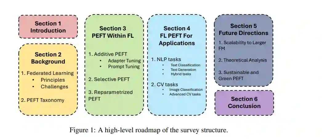 此外,我们还根据应用领域对文献进行整理,涵盖自然语言处理与计算机视觉任务。最后,本文讨论了若干值得关注的未来研究方向,包括面向更大规模基础模型的扩展、联邦PEFT方法的理论分析,以及适用于资源受限环境的可持续方案。