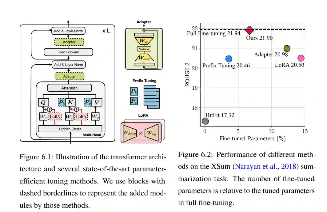**参数低效:**自监督预训练技术已在各种NLP任务上取得了巨大成功(Peters等人,2018;Devlin等人,2019a;Liu等人,2019a;Yang等人,2019)。通常,模型首先只在自监督损失的情况下对原始文本进行预训练,然后在带有标记数据的下游任务上对预训练模型进行微调。这样的管道已经成为当今创建最先进的NLG系统的事实标准。在这个方向上,研究人员正在追求越来越强大的预训练模型,这实际上在大多数情况下导致了更多的参数——越来越大的语言模型由数亿到万亿参数组成(Brown et al., 2020;Fedus等人,2021;Rae等人,2021)。这样,每个单独的微调过程都会获得巨大模型的不同副本,导致微调和推理时的参数利用率低下。当服务于大量任务时,这种参数低效会导致大量内存占用。