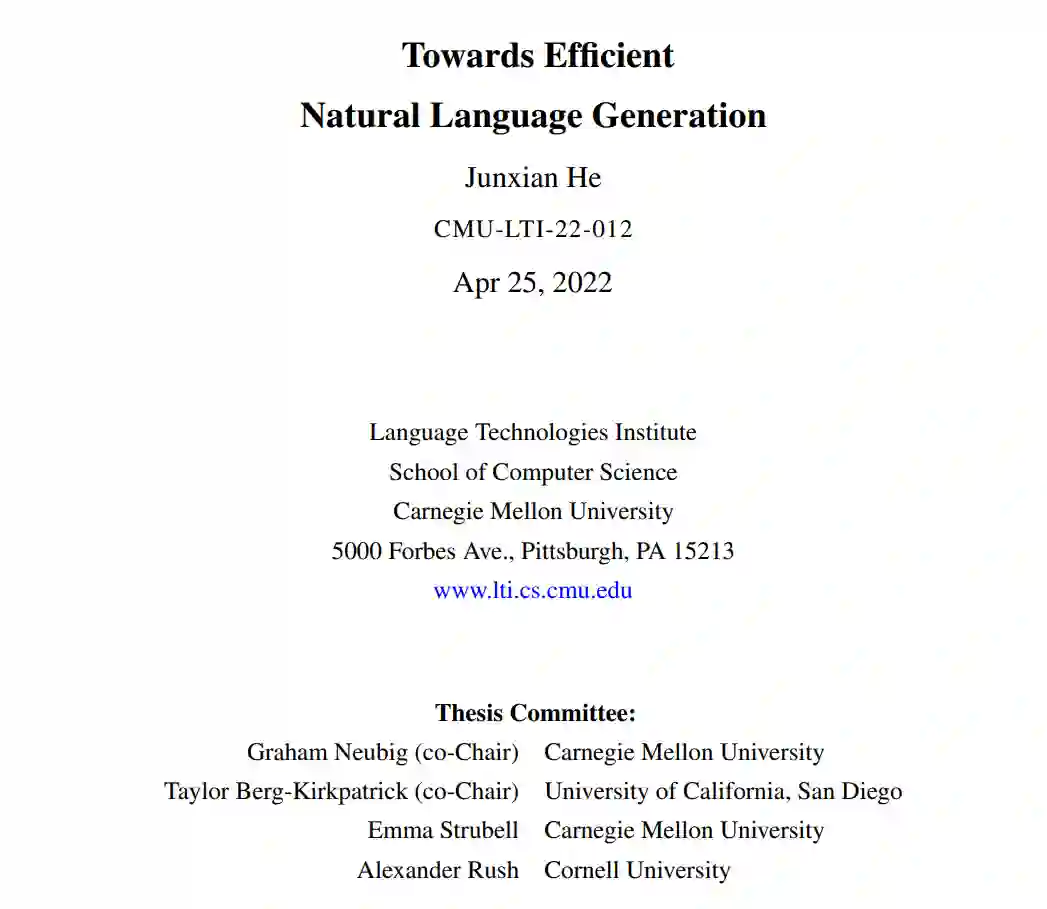 **本文旨在对高效NLG的研究问题有更深入的理解,并利用这些见解来设计更好的方法。**具体来说,(1)在标签效率方面,研究了无监督和半监督的条件生成,利用丰富的无标签文本数据,从而减轻了对大量标注样本的需求。所提出的方法在各种NLG任务上进行了验证;(2)在参数效率方面,本文提出了一个统一的框架来连接参数高效的迁移学习,其中只需要更新少数参数,就可以使大型预训练模型适应下游任务。所提出框架为这一方向提供了新的理解,以及为参数高效的NLG实例化最先进的方法;(3)对于检索增强NLG的计算效率,我们设计了新的模型或后适应检索组件,以压缩数据存储,减少检索计算,并加快推理。 语言是人类交流的主要媒介。在人工智能中,语言是机器与人交流的主要接口之一,因此机器需要能够理解并生成自然语言。本文重点研究后者,即自然语言生成。自然语言生成是最基本的范畴之一的任务在NLP,横跨在机器翻译(Bahdanau et al ., 2015),文本摘要(Rush et al ., 2015),对话生成(Sordoni et al ., 2015),数据描述(Novikova et al ., 2017),等等。随着近年来深度学习在NLP领域的快速发展(Hochreiter and Schmidhuber, 1997;Bahdanau等人,2015;Vaswani et al., 2017),我们已经见证了这些任务的巨大进展。特别是大规模的自监督预训练(Peters等人,2018;Devlin等人,2019a;)将NLG任务的性能提升到了一个新的水平(Lewis等人,2020a;Raffel等人,2020)。最近,越来越大的预训练语言模型显示出了将所有NLP任务作为生成任务处理的潜力,在适当的文本提示下实现有竞争力的零次或少次结果(Radford et al., 2019; Brown et al., 2020; Schick and Schütze, 2021c; Du et al., 2021; Liu et al., 2021a; Sanh et al., 2022)。尽管取得了巨大的成功,但目前的NLG方法在许多方面都是低效的,这阻止了它们在更广泛的环境中使用。在本文中,我们考虑了以下三个方面的低效率。