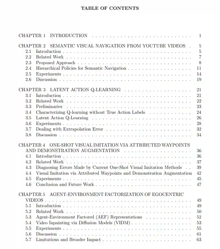沿着这一趋势,大规模基于学习的方法为机器人研究提供了一条有前景的发展路径。这种思路自然引出了两个问题:我们能从哪里收集合适的数据?如何利用这些数据创造有效的机器人系统?幸运的是,已经存在大量数据,展示了机器人需要理解的现实环境和交互的复杂性,这些数据以视频的形式存在。然而,这些视频数据不能直接应用传统的机器人学习技术。视频可能缺乏明确的动作或目标标签,通常展示的是次优的轨迹,并且在视觉上和动态上存在显著的体现差距。这些挑战突显了需要新的机器人学习方法,以克服这些障碍。在本研究中,我们展示了通过“野外视频”实现大规模机器人学习目标的努力,开发了针对每个限制机器人从视频中学习的挑战的解决方法。我们介绍了如何从未标注的视频数据中推断动作和目标,如何从次优数据中学习最佳行为,并通过利用因子化表示来解决体现差距问题。总体而言,本论文为如何利用视频数据进行大规模机器人学习奠定了基础。我们希望这项工作能成为实现通用机器人代理的一步,从而在世界上产生积极的影响。