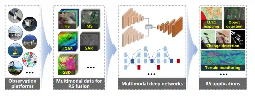 由于RS在观测地球环境方面的优势,在各种EO任务中发挥着越来越重要的作用(Hong et al., 2021b; Zhang et al., 2019a)。随着多模态RS数据的可用性不断增加,研究人员可以方便地访问这些数据,这适合于现有的应用。尽管有大量的多模态数据可用,但每个模态几乎不能捕捉到一个或几个特定的属性,因此不能完全描述观测到的场景,这对后续应用造成了很大的限制。自然,多模态遥感数据融合是突破单模态数据困境的一条可行途径。通过整合从多模态数据中提取的互补信息,可以在许多任务中做出更稳健可靠的决策,如变化检测、LULC分类等。与多源、多时相遥感不同,“模态”一词一直缺乏明确、统一的定义。